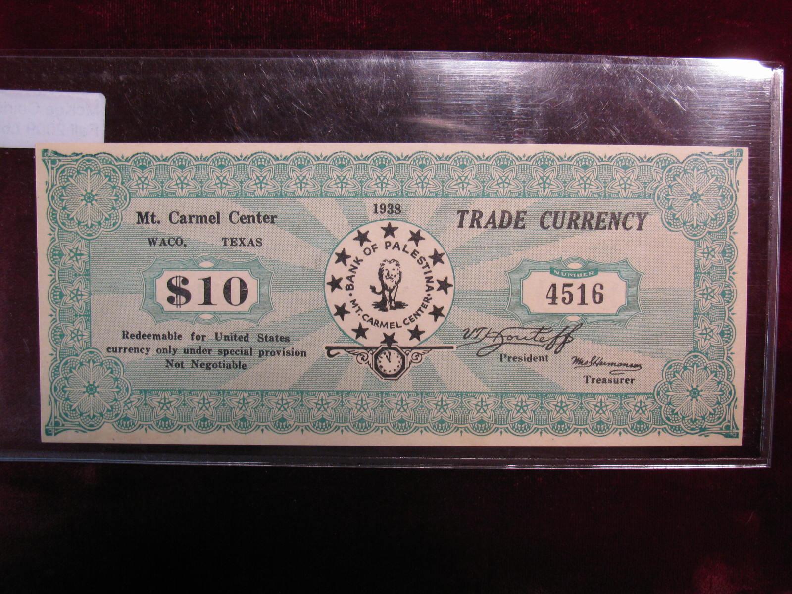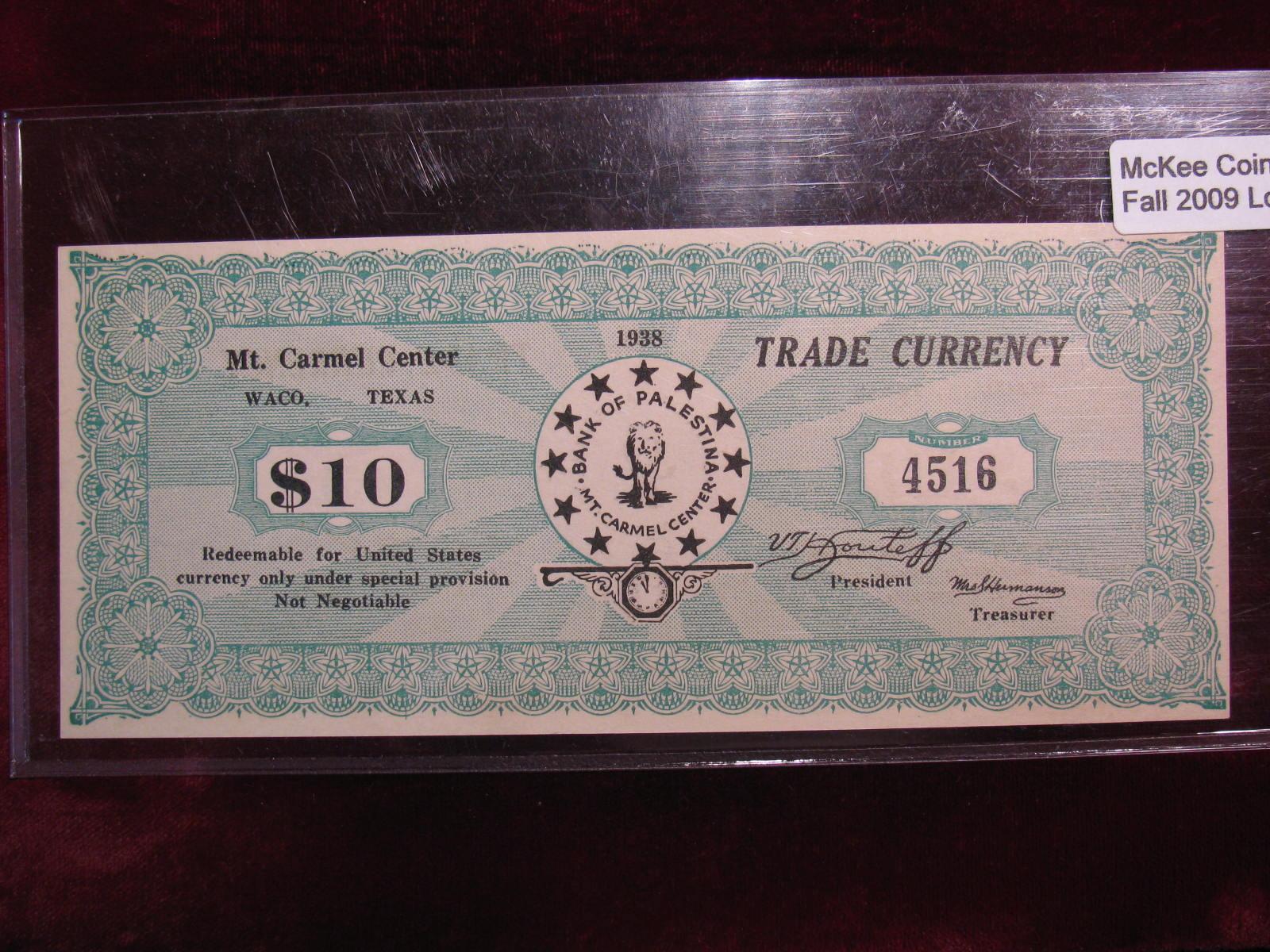 2593. 1938 Bank Of Palestine Mt. Carmel Center $10 Trade Currency, Waco,Texas. Unc.