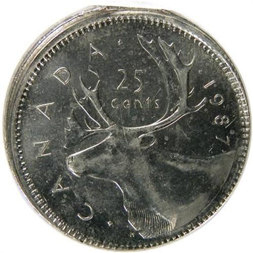 Twenty-Five Cents 1987 Partial Out-of-Collar Strike with a small Straight Clip. A bit off-centre toward 7 o’clock, Uncirculated
