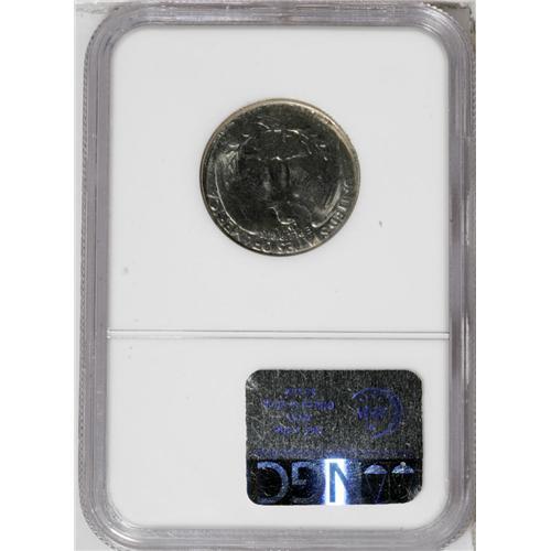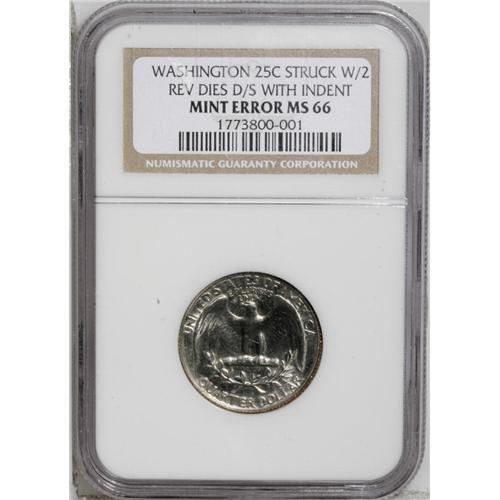 <B>Undated<25C> Washington Quarter--Double Struck With Two Reverse Dies and Indent--MS66 NGC.</B></I> This unbelievable modern error is extremely important, a coin that was thought to be impossible until a similar specimen was discovered and authenticated a few years ago. This coin has been struck from two reverse dies, and authenticated both by the Secret Service and NGC. The nickel-gray fields are fully lustrous and lightly reflective. The first reverse (face-forward reverse in the NGC encapsulation) is well struck, but a bit flat at the centers of UNITED STATES OF AMERICA and showing minor distortion atop QUARTER DOLLAR. The other reverse was apparently struck normally once. It was then struck a second time by a blank planchet on top, resulting in swelling and distortion. The arc-shaped outline of the second planchet is most visible at ER DOLLAR. There are no abrasions on this fascinating and clearly Uncirculated piece.<BR> This coin was found in a California safe deposit box in about the year 2000, with many other errors struck in the mid to late 1960s at the San Francisco Mint. This piece was once paired with another clad quarter with two reverses. Fred Weinberg sold that coin by private treaty at the 2001 ANA show for $80,000. The pieces, thought be experimental, were coined at a time in San Francisco when many other unusual and provocative pieces were produced. Many of them came onto the market from the same hoard, which the State of California auctioned.<BR> This piece is similar to another special coin struck from two dies that were not intended to be used together, the famous 1999 cent/dime mule that Heritage recently sold for $138,000. While this piece is not unique, it is equally special and would be the highlight of any advanced error or rarity collection.<BR><I>Ex: Lake Michigan & Springdale Collections (American Numismatic Rarities, 6/06), lot 1913.</B></I> <BR><BR><B>Im