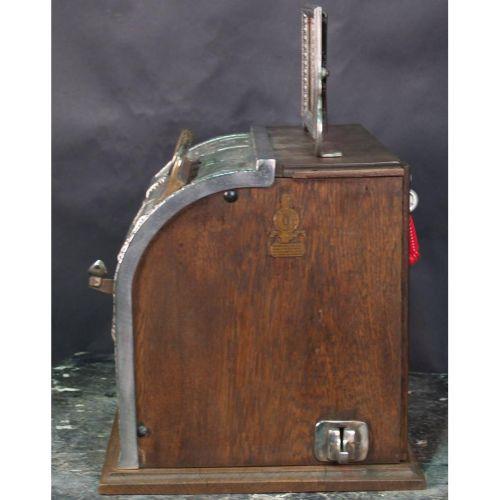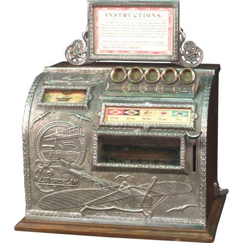 25c 1911 Mills L'Aeroplan Cast-Iron & Oak Trade Stimulator Pays out & comes w/Tokens working w/lock & key