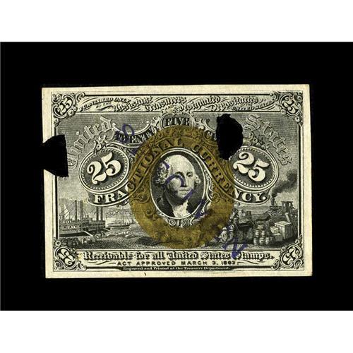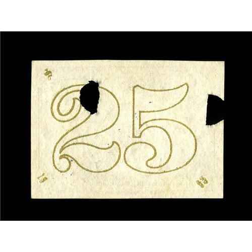 <B>Fr. 1286 25c Experimental Second Issue Very Choice New.</B></I> This is a very nice experimental with bright bronzing and "S-18-63" surcharges on the back. This well margined piece would easily achieve the gem grade but for one of the half moon cancellations cutting into the left edge.