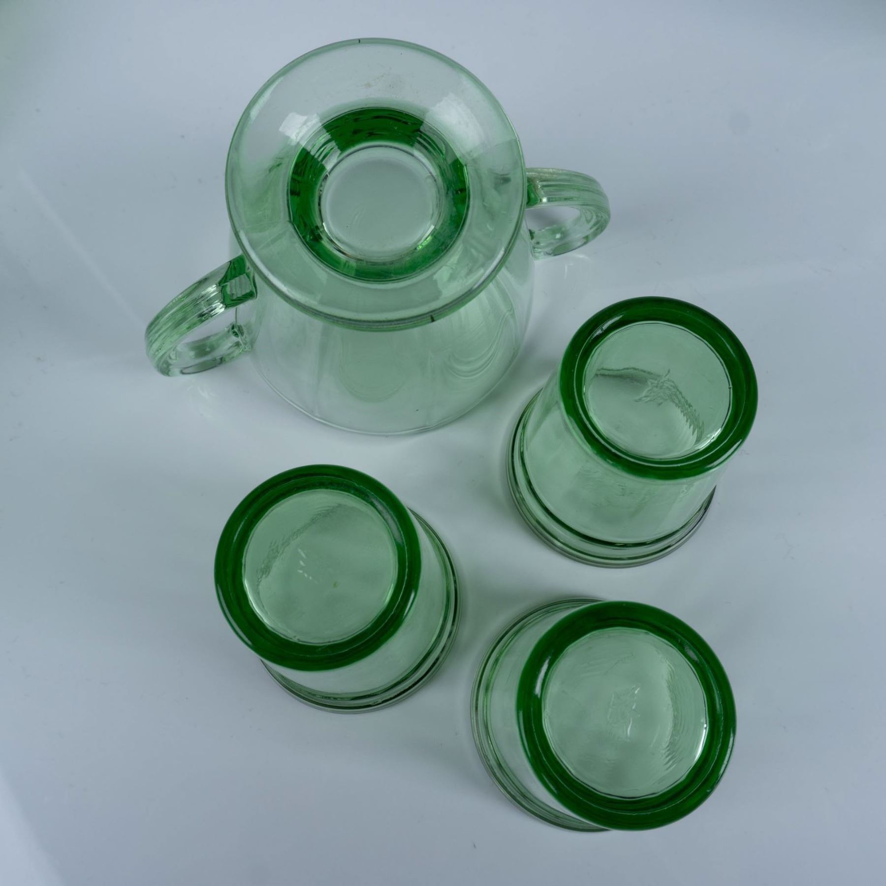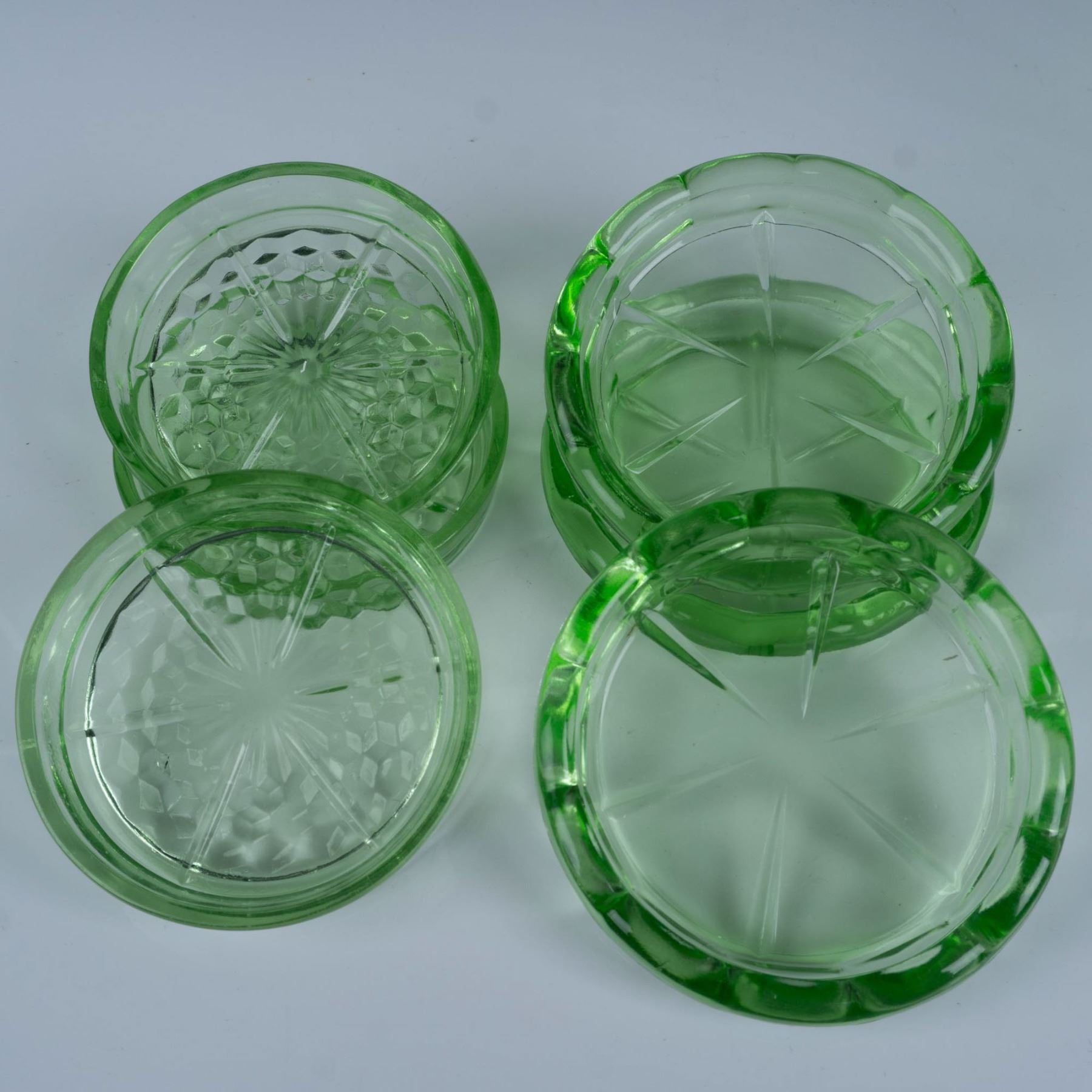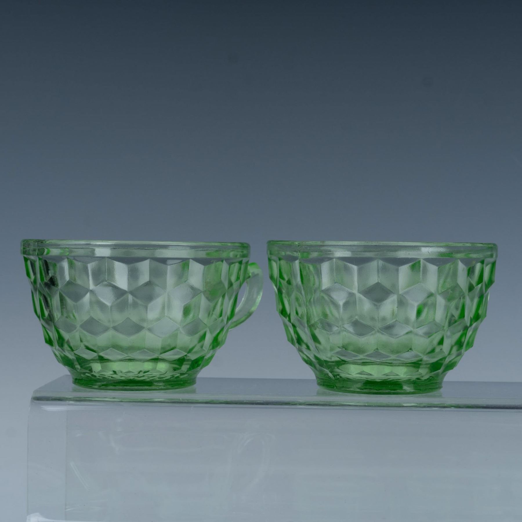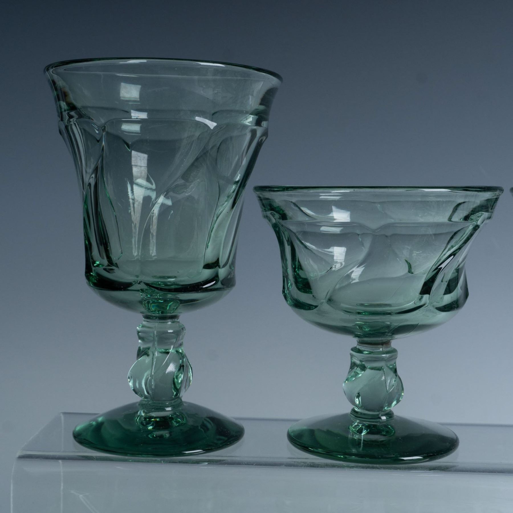 Features 4 teacups, 6 coasters, 3 cocktail glasses, 4 sherbet glasses, a water goblet, 3 shot glasses, and a stopper. Also included are 3 sugar bowls with handles, one made out of uranium glass and one with a lid. Largest measures 3.75"L x 3.75"W x 6"H. Smallest measures 1"L x 1"W x 2.24"H.