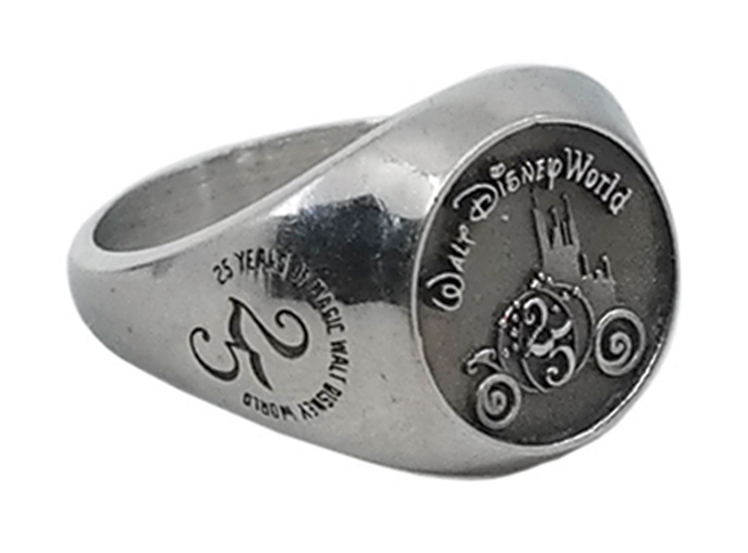 (Walt Disney World, 1996) A rare ring that was given to cast members in celebration of the 25th anniversary of Walt Disney World. Text celebrating this milestone anniversary is written along the sides. The ring has an opening diameter of approximately 0.75" and is in very good condition with minor wear to the inside of ring from use.