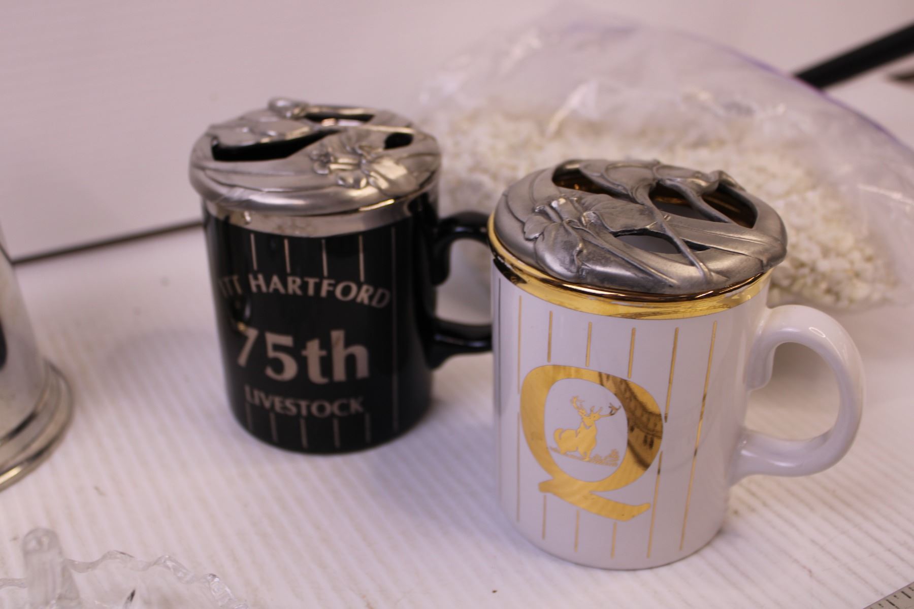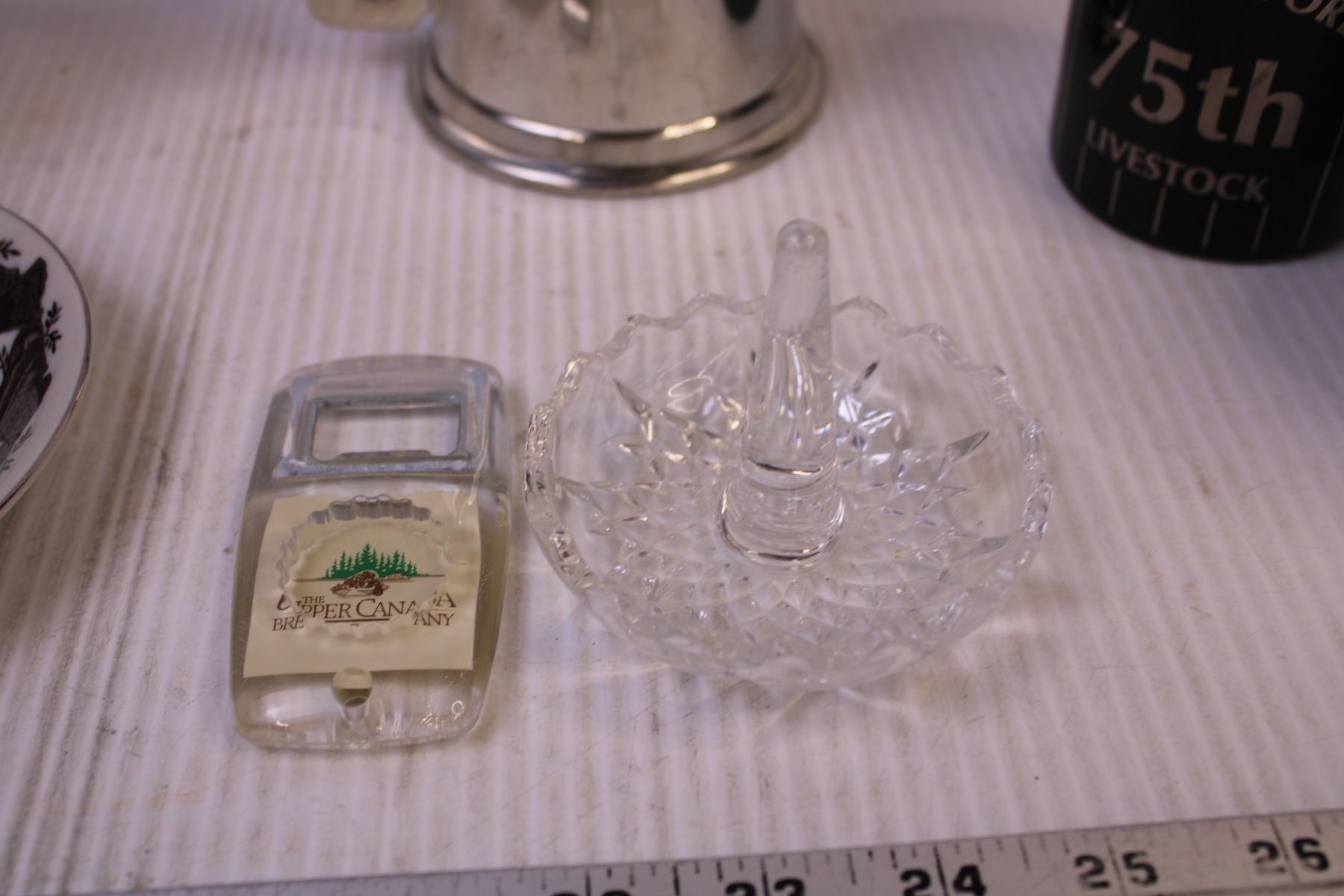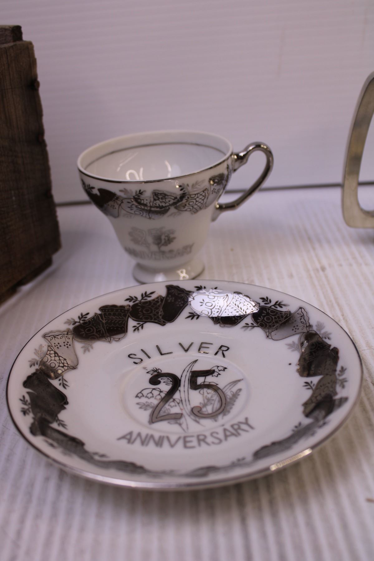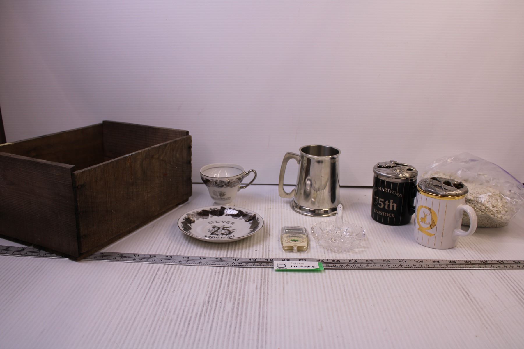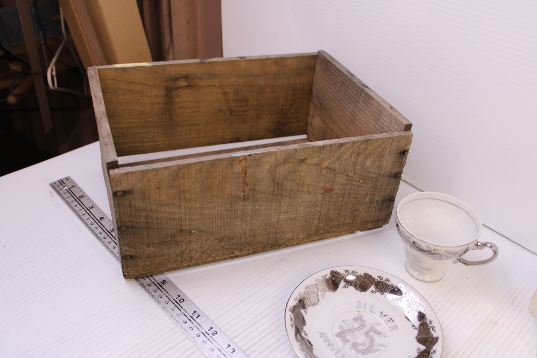 25th Anniversary Tea Cup and Saucer, Small Wooden Crate, (2) Mugs and Misc