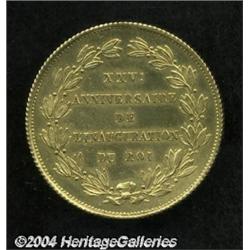25th Anniversary of Independence Gold Medallic 40 francs 1856, French legend, Dup-570, KM-M10, XF. This is a restrike with numerous small planchet flaws.From the Marshall Frumer Collection. Important notice: Heritage usually auctions material at the rate of 200-250 lots per hour. On some occasions eBay Live bid software or the Internet may not be able to keep up with the pace of the auction. We recommend placing a realistic absentee bid now as insurance to avoid disappointment. Occasionally the auctioneer may eliminate or reject an eBay Live bid, and the auctioneer may also reopen a lot after the close of the eBay live bidding (usually because we missed an audience bid), and may reject your bid even if it shows you as the winning bidder. By bidding via eBay Live, you agree that Heritage may award the lot to another bidder at its sole discretion under the circumstances described above or any other reasonable circumstances. Also please note that all Heritage lots purchased through eBay Live carry a 20% Buyer's Premium. Please make sure you read the Terms and Conditions before you bid.