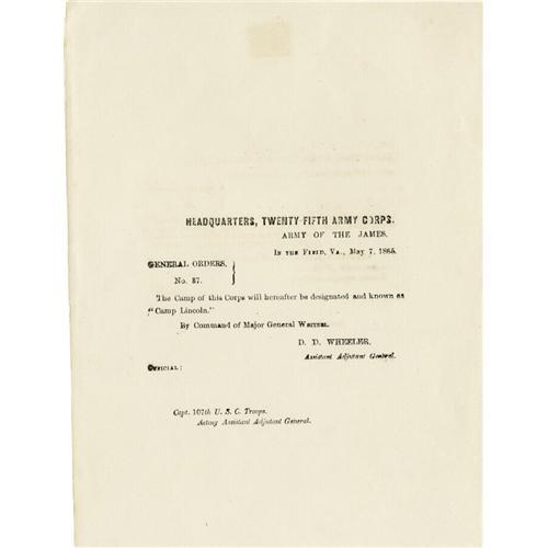 <B>Field-printed 25th Corp General Orders Honoring Lincoln,</B></I> one page, 5.25" x 7". In the rush to honor the assassinated president, this field order was issued: "HEADQUARTERS, TWENTY-FIFTH ARMY CORPS. ARMY OF THE JAMES. In the Field, VA., May 7, 1865. GENERAL ORDERS, NO. 87. The Camp of this Corps will hereafter be designated and known as 'Camp Lincoln.' By command of Major General Weitzel. -- D. D. Wheeler, Assistant Adjutant General. Official: Capt. 107th U.S.C. Troops Acting Assistant Adjutant General." Light browning, else very fine condition.An excellent and excessively rare piece articulating homage from black soldiers for Lincoln. The 25th Corps was organized on December 3, 1864, and served as an all-black corps until disbanded on January 8, 1866. The 25th had the distinction of being the first Union corps to enter Richmond.<BR><BR><b>Shipping:</b> Miscellaneous Collectibles, Smal (<a target="_blank" href="http://www.heritageauctions.com/common/shipping.php">view shipping information</a>)