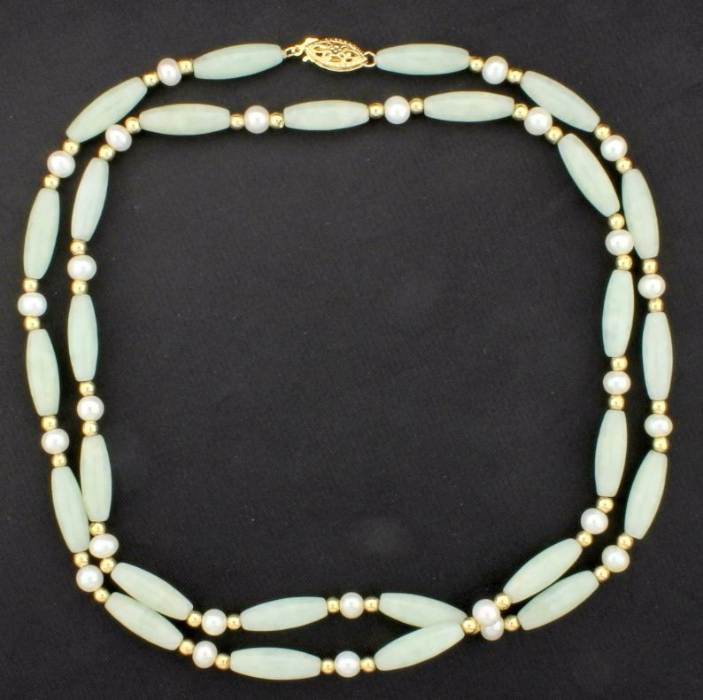 With a 14K yellow gold clasp and spacer balls. There are twenty eight 5mm pearls and twenty seven 15x5mm tubular shaped beautiful jade gemstones. 24.6g