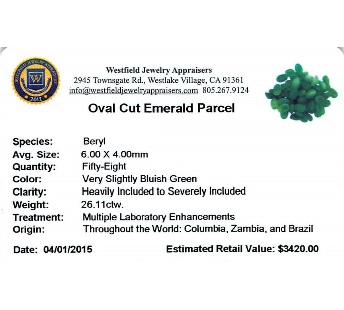 Sixty-three oval mixed cut natural emeralds exact total weight 26.11ct., clarity is heavily included, type III, medium dark, very slightly grayish, very slightly bluish green color, (GIA vslbG 6/3), cut is good. Westfield Appraised at $3,420.00.