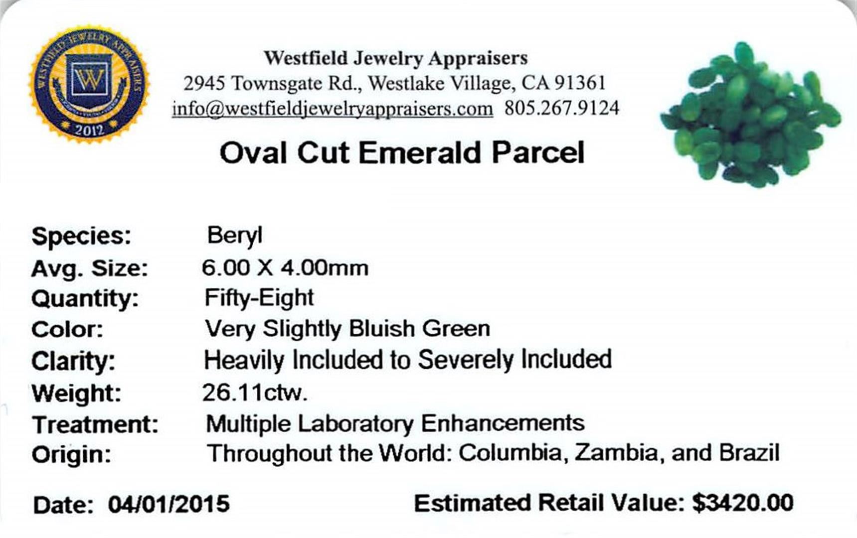 Sixty-three oval mixed cut natural emeralds exact total weight 26.11ct., clarity is heavily included, type III, medium dark, very slightly grayish, very slightly bluish green color, (GIA vslbG 6/3), cut is good. Westfield Appraised at $3,420.00.