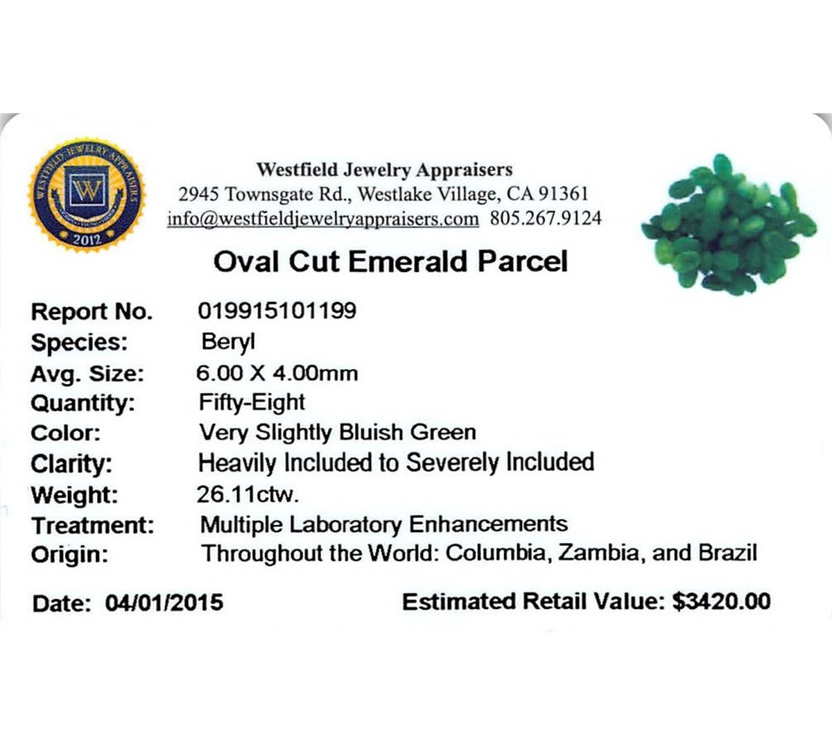 Sixty-three oval mixed cut natural emeralds exact total weight 26.11ct., clarity is heavily included, type III, medium dark, very slightly grayish, very slightly bluish green color, (GIA vslbG 6/3), cut is good. Westfield Appraised at $3,420.00.