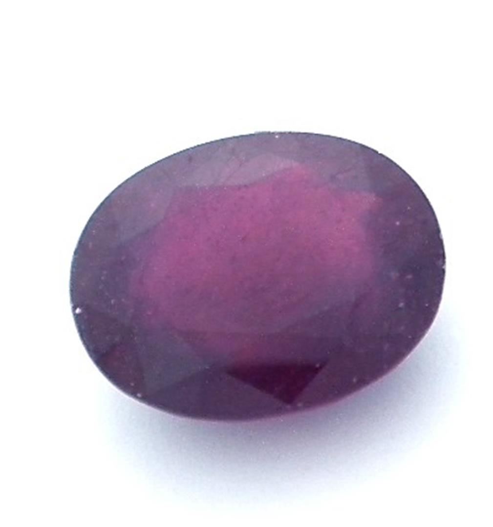 One oval mixed cut natural ruby, measuring 19.50 x 16.00 x 7.50mm, exact weight 26.14ct., clarity is heavily included, type II, dark, very slightly brownish, slightly purplish red color, (GIA slpR 7/3), cut is good. Transmitting light somewhat diffusely, transparent to translucent. Naturally occurring internal & external characteristics are present. Indications of laboratory high temperature heat treatment, with glass & flux additives. Ruby has a low tolerance to rhodium plating, repolishing the surface, & ultrasonic cleaning. Westfield Appraised at $3,520.00.