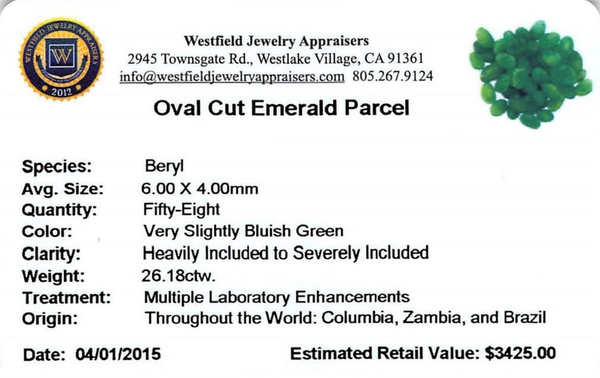 Fifty-eight oval mixed cut natural emeralds exact total weight 26.18ct., clarity is heavily included, type III, medium dark, very slightly grayish, very slightly bluish green color, (GIA vslbG 6/3), cut is good. Westfield Appraised at $3,425.00.