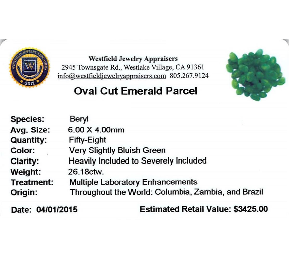 Fifty-eight oval mixed cut natural emeralds exact total weight 26.18ct., clarity is heavily included, type III, medium dark, very slightly grayish, very slightly bluish green color, (GIA vslbG 6/3), cut is good. Westfield Appraised at $3,425.00.