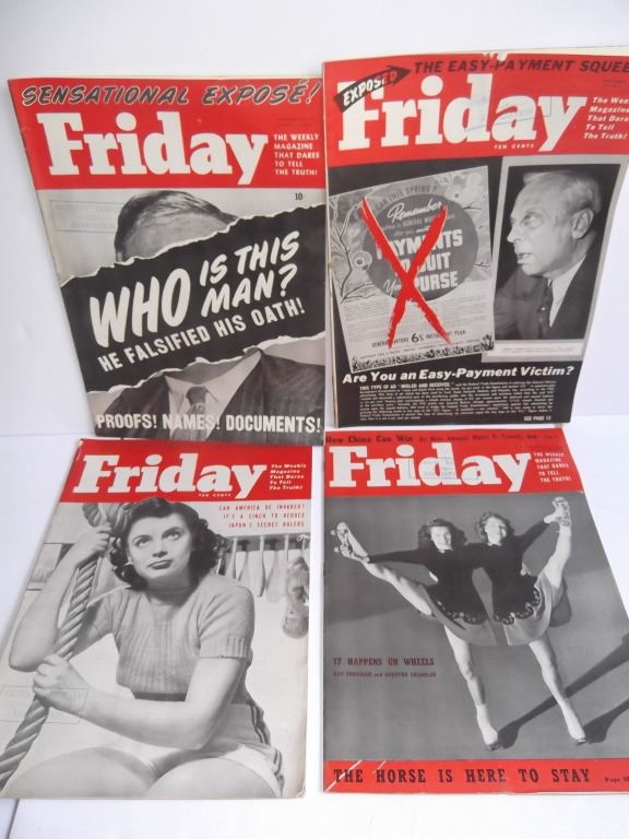26 1940's "Friday, the weekly magazine that dares to tell the truth". Several covers not attached; taped; library stamp; written on.