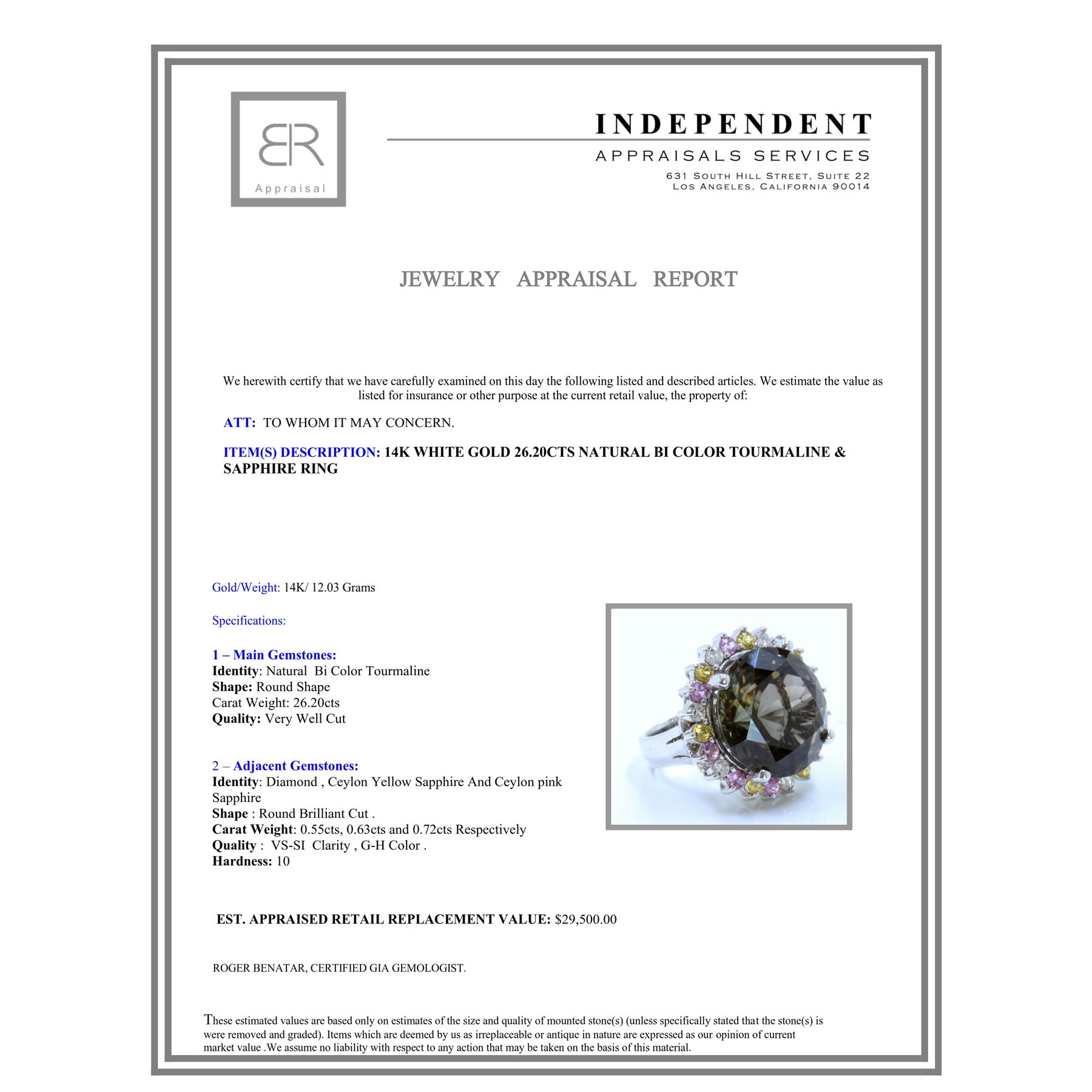 14K WHITE GOLD RING 12.03gm / 26.20CTS NATURAL BI COLOR TOURMALINE / 0.55ct DIAMOND / 0.63ct NATURAL CEYLON YELLOW SAPPHIRE / 0.72ct NATURAL CEYLON pink Sapphire #GVR1348