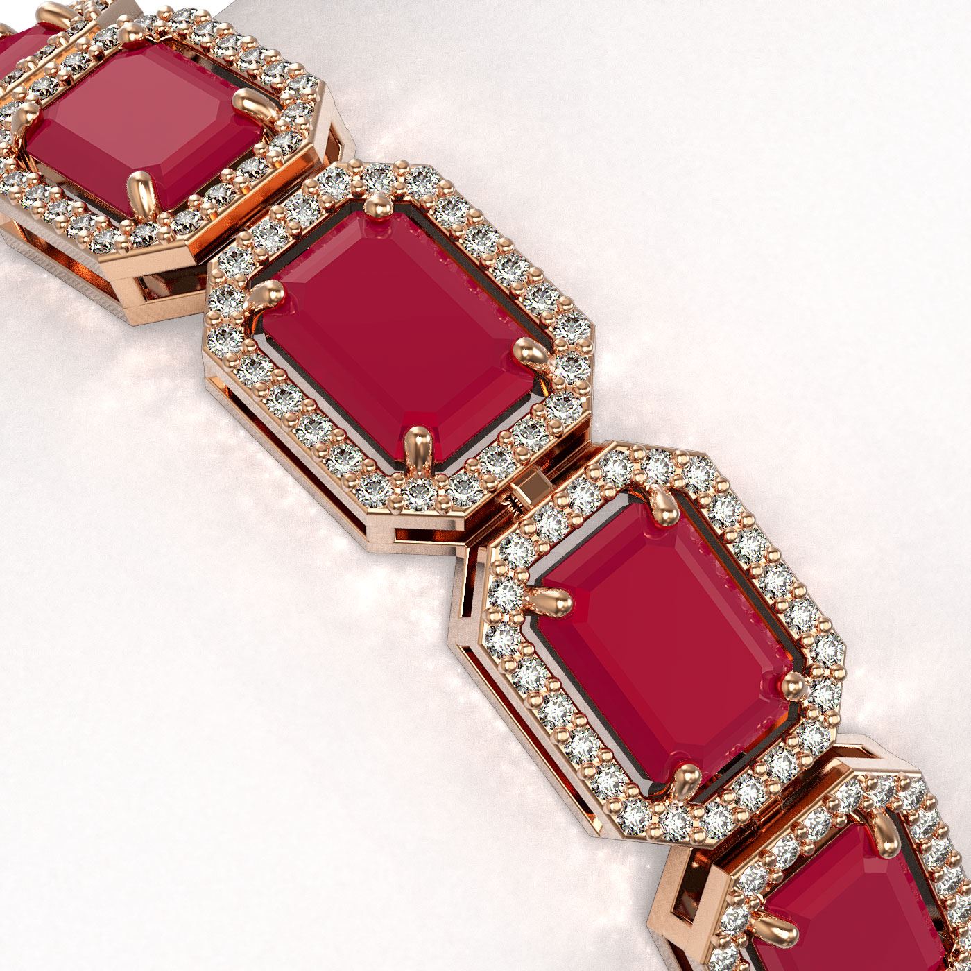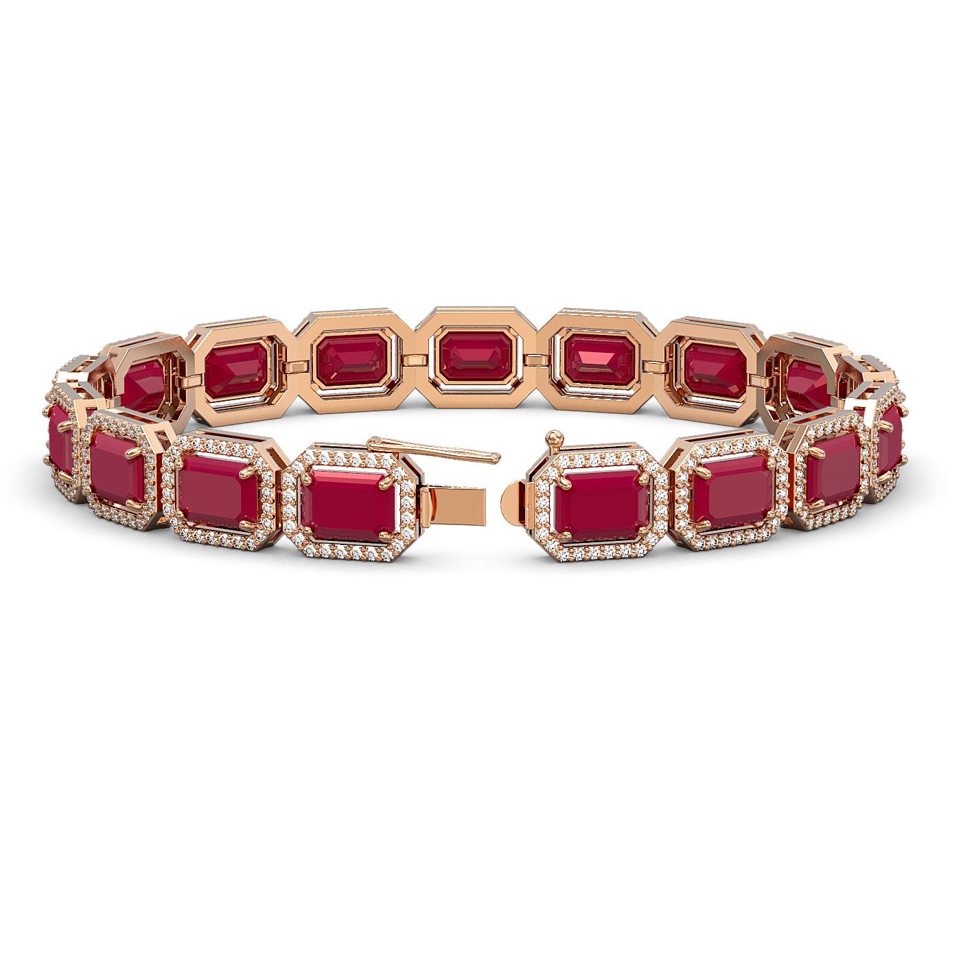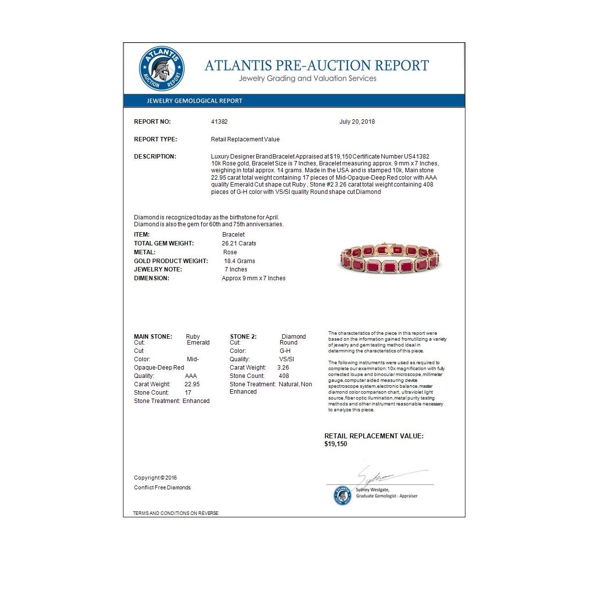 REF-347Y8K -41382 ---- 26.21 CTW Ruby & Diamond Halo Bracelet 10K Rose Gold ---- Luxury Designer Brand Bracelet Appraised at $19,150 Certificate Number US41382 10k Rose gold, Bracelet Size is 7 Inches, Bracelet measuring approx. 9 mm x 7 Inches, weighing in total approx. 14 grams. Made in the USA and is stamped 10k, Main stone 22.95 carat total weight containing 17 pieces of Mid-Opaque-Deep Red color with AAA quality Emerald Cut shape cut Ruby , Stone #2 3.26 carat total weight containing 408 pieces of G-H color with VS/SI quality Round shape cut Diamond