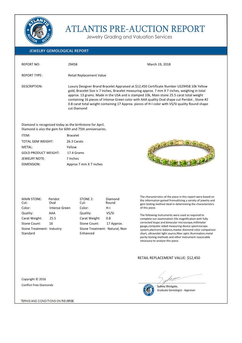 REF-174W4F -29458 ---- 26.3 CTW Peridot & VS/SI Certified Diamond Bracelet Gold 10K Yellow Gold ---- Luxury Designer Brand Bracelet Appraised at $12,450 Certificate Number US29458 10k Yellow gold, Bracelet Size is 7 Inches, Bracelet measuring approx. 7 mm X 7 inches, weighing in total approx. 13 grams. Made in the USA and is stamped 10k, Main stone 25.5 carat total weight containing 16 pieces of Intense Green color with AAA quality Oval shape cut Peridot , Stone #2 0.8 carat total weight containing 17 Approx. pieces of H-I color with VS/SI quality Round shape cut Diamond