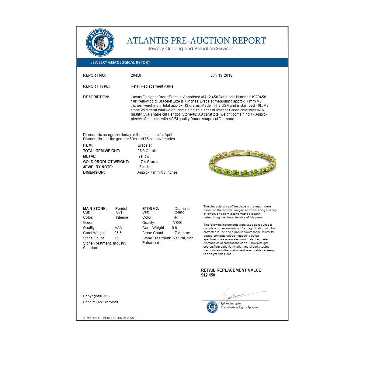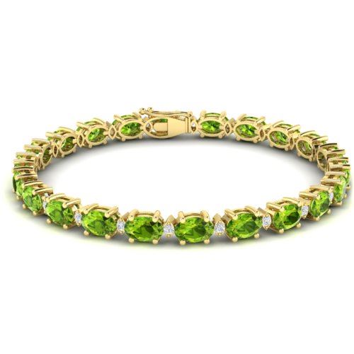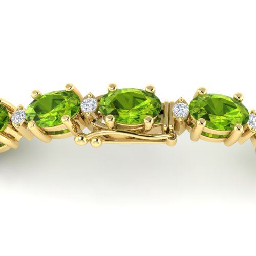 REF-174W4F -29458 ---- 26.3 CTW Peridot & VS/SI Certified Diamond Bracelet Gold 10K Yellow Gold ---- Luxury Designer Brand Bracelet Appraised at $12,450 Certificate Number US29458 10k Yellow gold, Bracelet Size is 7 Inches, Bracelet measuring approx. 7 mm X 7 inches, weighing in total approx. 13 grams. Made in the USA and is stamped 10k, Main stone 25.5 carat total weight containing 16 pieces of Intense Green color with AAA quality Oval shape cut Peridot , Stone #2 0.8 carat total weight containing 17 Approx. pieces of H-I color with VS/SI quality Round shape cut Diamond