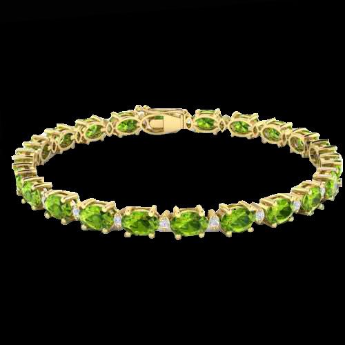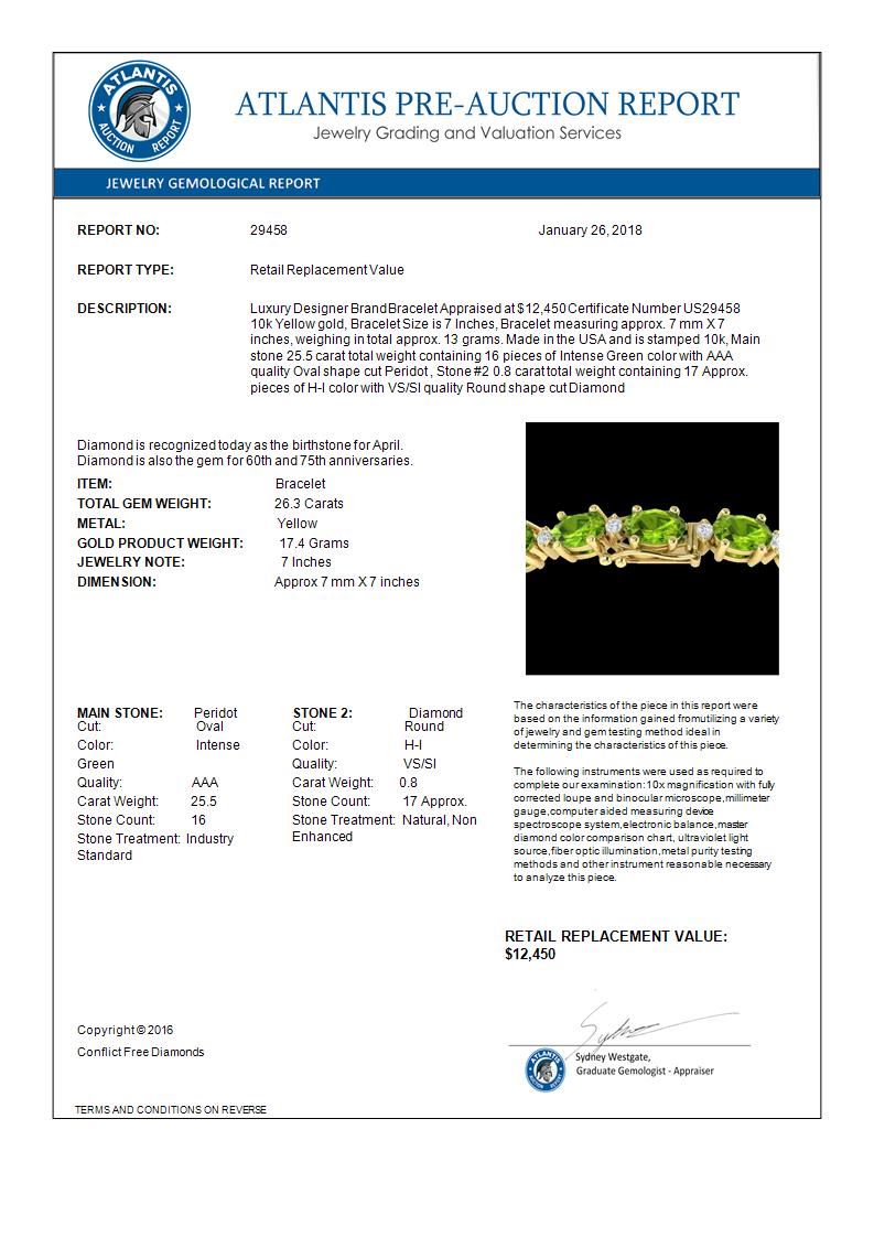 REF-174Y4K -29458 ---- 26.3 CTW Peridot & VS/SI Certified Diamond Bracelet Gold 10K Yellow Gold ---- Luxury Designer Brand Bracelet Appraised at $12,450 Certificate Number US29458 10k Yellow gold, Bracelet Size is 7 Inches, Bracelet measuring approx. 7 mm X 7 inches, weighing in total approx. 13 grams. Made in the USA and is stamped 10k, Main stone 25.5 carat total weight containing 16 pieces of Intense Green color with AAA quality Oval shape cut Peridot , Stone #2 0.8 carat total weight containing 17 Approx. pieces of H-I color with VS/SI quality Round shape cut Diamond