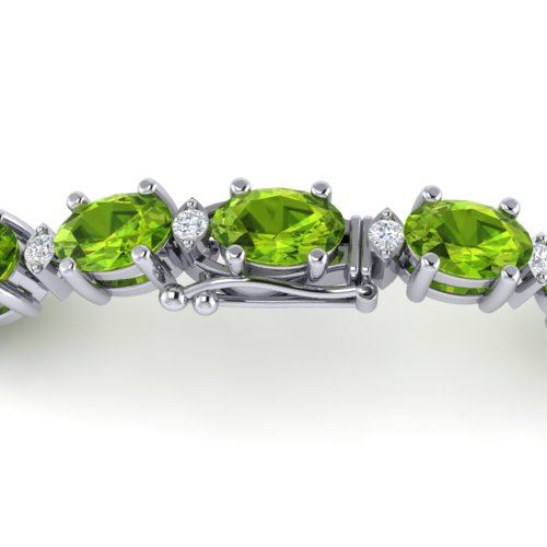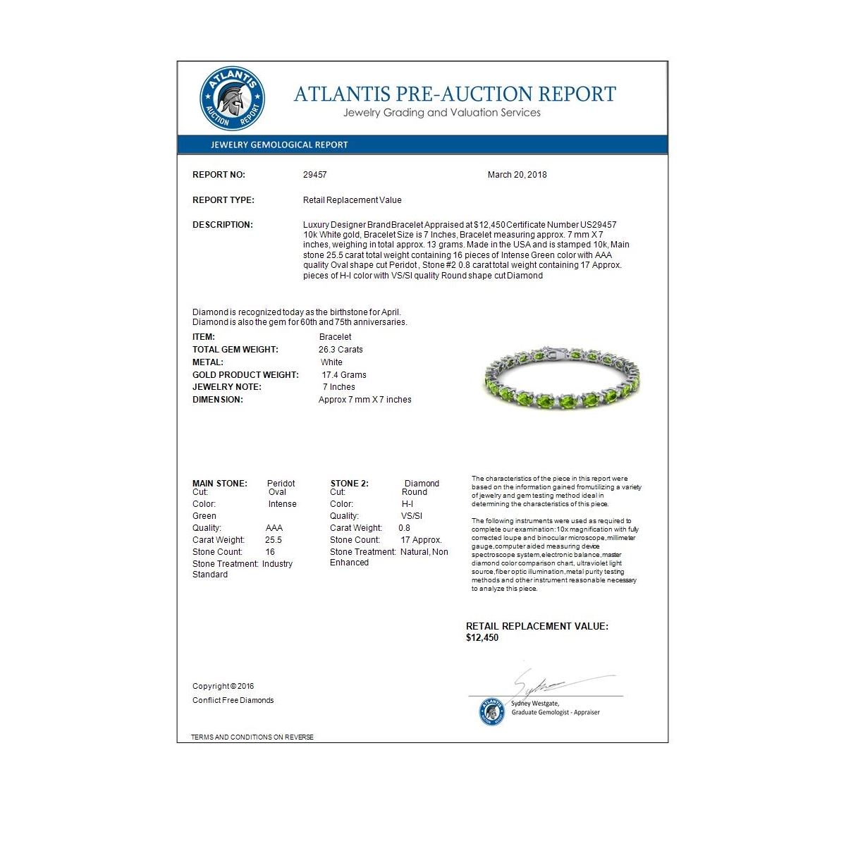 REF-174H4A -29457 ---- 26.3 CTW Peridot & VS/SI Certified Diamond Eternity Bracelet 10K White Gold ---- Luxury Designer Brand Bracelet Appraised at $12,450 Certificate Number US29457 10k White gold, Bracelet Size is 7 Inches, Bracelet measuring approx. 7 mm X 7 inches, weighing in total approx. 13 grams. Made in the USA and is stamped 10k, Main stone 25.5 carat total weight containing 16 pieces of Intense Green color with AAA quality Oval shape cut Peridot , Stone #2 0.8 carat total weight containing 17 Approx. pieces of H-I color with VS/SI quality Round shape cut Diamond