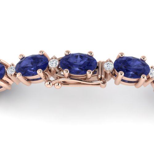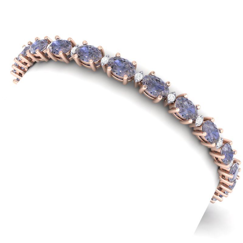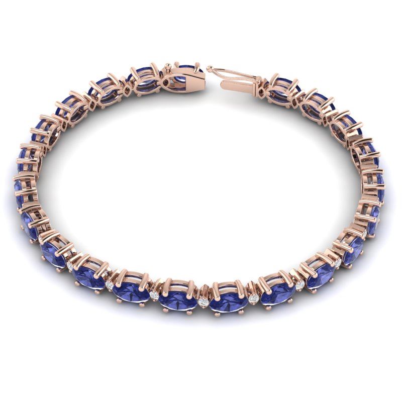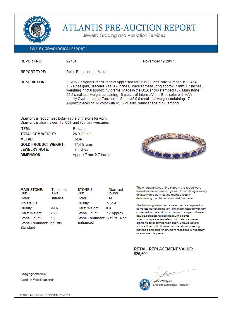 REF-345X5T -29464 ---- 26.3 CTW Tanzanite & VS/SI Certified Diamond Eternity Bracelet 10K Rose Gold ---- Luxury Designer Brand Bracelet Appraised at $26,600 Certificate Number US29464 10k Rose gold, Bracelet Size is 7 Inches, Bracelet measuring approx. 7 mm X 7 inches, weighing in total approx. 13 grams. Made in the USA and is stamped 10k, Main stone 25.5 carat total weight containing 16 pieces of Intense Violet Blue color with AAA quality Oval shape cut Tanzanite , Stone #2 0.8 carat total weight containing 17 Approx. pieces of H-I color with VS/SI quality Round shape cut Diamond