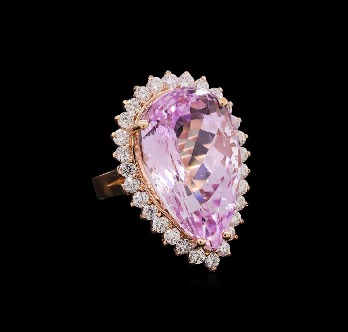 One electronically tested 14KT rose gold lady's cast fashion ring with a basket halo with a bright polish finish. The featured lady's ring has a shank measuring 3.36 millimeters in width. Identified with markings of "K14". Condition is new, good workmanship. Containing: One prong set pear modified brilliant cut natural kunzite, measuring 23.01 x 14.60 x 11.55mm, (depth est.) 3%. bulge factor, approximate weight of 26.32ct., clarity is eye clean, medium light, moderately strong, purple red color, (GIA PR 4/4), cut is very good. Transmitting light with no distortion, transparent. Colored gemstones are presumed to have been subjected to commonly used enhancement processes. Graded in the setting. Twenty-Nine prong set round brilliant cut diamonds, measuring 2.30 - 2.25 x 1.41mm (depth est.) approximate total weight of 29 Stones = 1.35ct. Graded in the setting. Clarity: SI-1 to SI-2. Color: H - I. Cut Good. Total Weight of Colored Stones 26.32ct. Total Weight of Diamonds 1.35ct. Total Weight of Ring 13.50gm. GAS Appraised at $11,555.00.