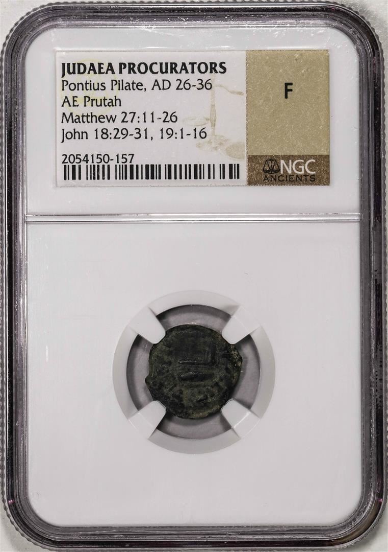 One 26-36AD Judaea Procurators Pontius Pilates AE Prutah Ancient Coin NGC F. NGC Certified.