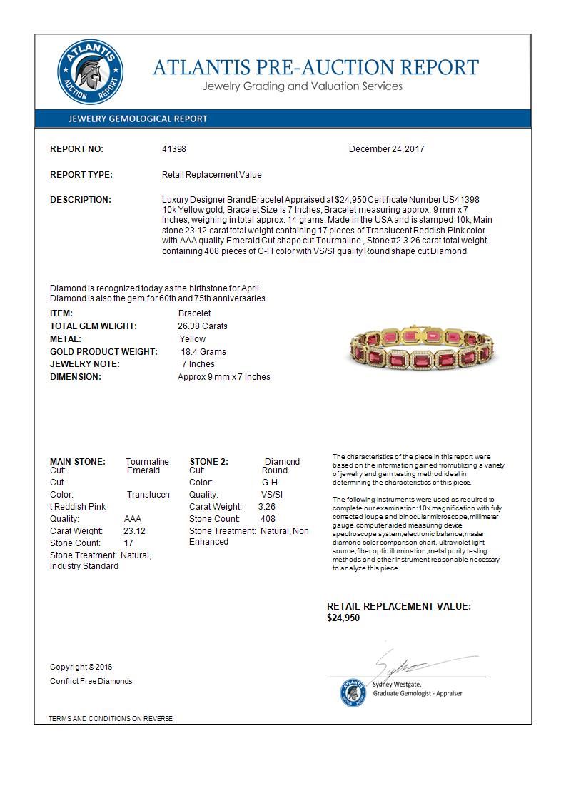 REF-453M3H -41398 ---- 26.38 CTW Tourmaline & Diamond Halo Bracelet 10K Yellow Gold ---- Luxury Designer Brand Bracelet Appraised at $24,950 Certificate Number US41398 10k Yellow gold, Bracelet Size is 7 Inches, Bracelet measuring approx. 9 mm x 7 Inches, weighing in total approx. 14 grams. Made in the USA and is stamped 10k, Main stone 23.12 carat total weight containing 17 pieces of Translucent Reddish Pink color with AAA quality Emerald Cut shape cut Tourmaline , Stone #2 3.26 carat total weight containing 408 pieces of G-H color with VS/SI quality Round shape cut Diamond