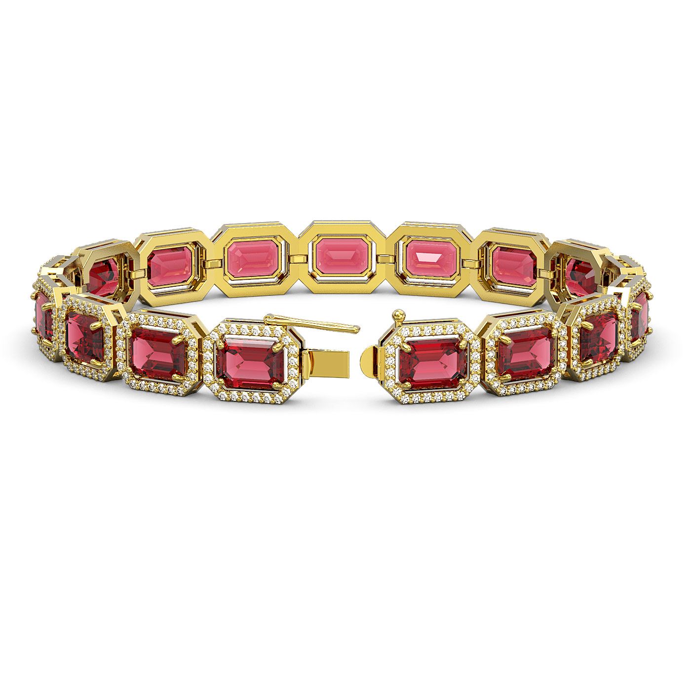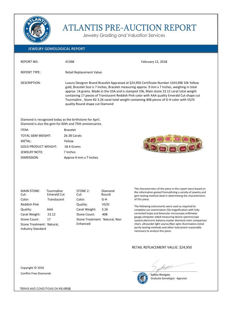 REF-453M3H -41398 ---- 26.38 CTW Tourmaline & Diamond Halo Bracelet 10K Yellow Gold ---- Luxury Designer Brand Bracelet Appraised at $24,950 Certificate Number US41398 10k Yellow gold, Bracelet Size is 7 Inches, Bracelet measuring approx. 9 mm x 7 Inches, weighing in total approx. 14 grams. Made in the USA and is stamped 10k, Main stone 23.12 carat total weight containing 17 pieces of Translucent Reddish Pink color with AAA quality Emerald Cut shape cut Tourmaline , Stone #2 3.26 carat total weight containing 408 pieces of G-H color with VS/SI quality Round shape cut Diamond