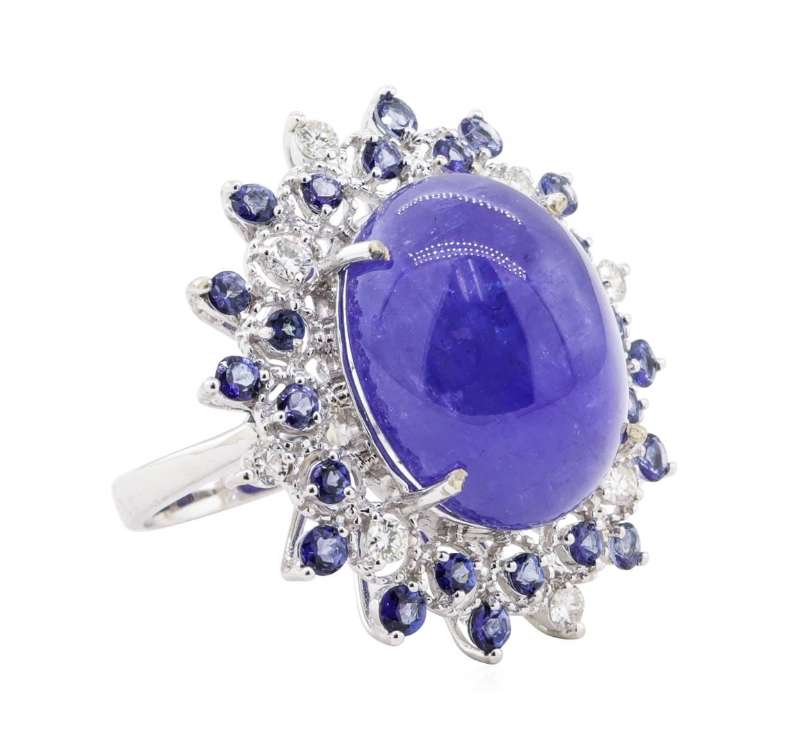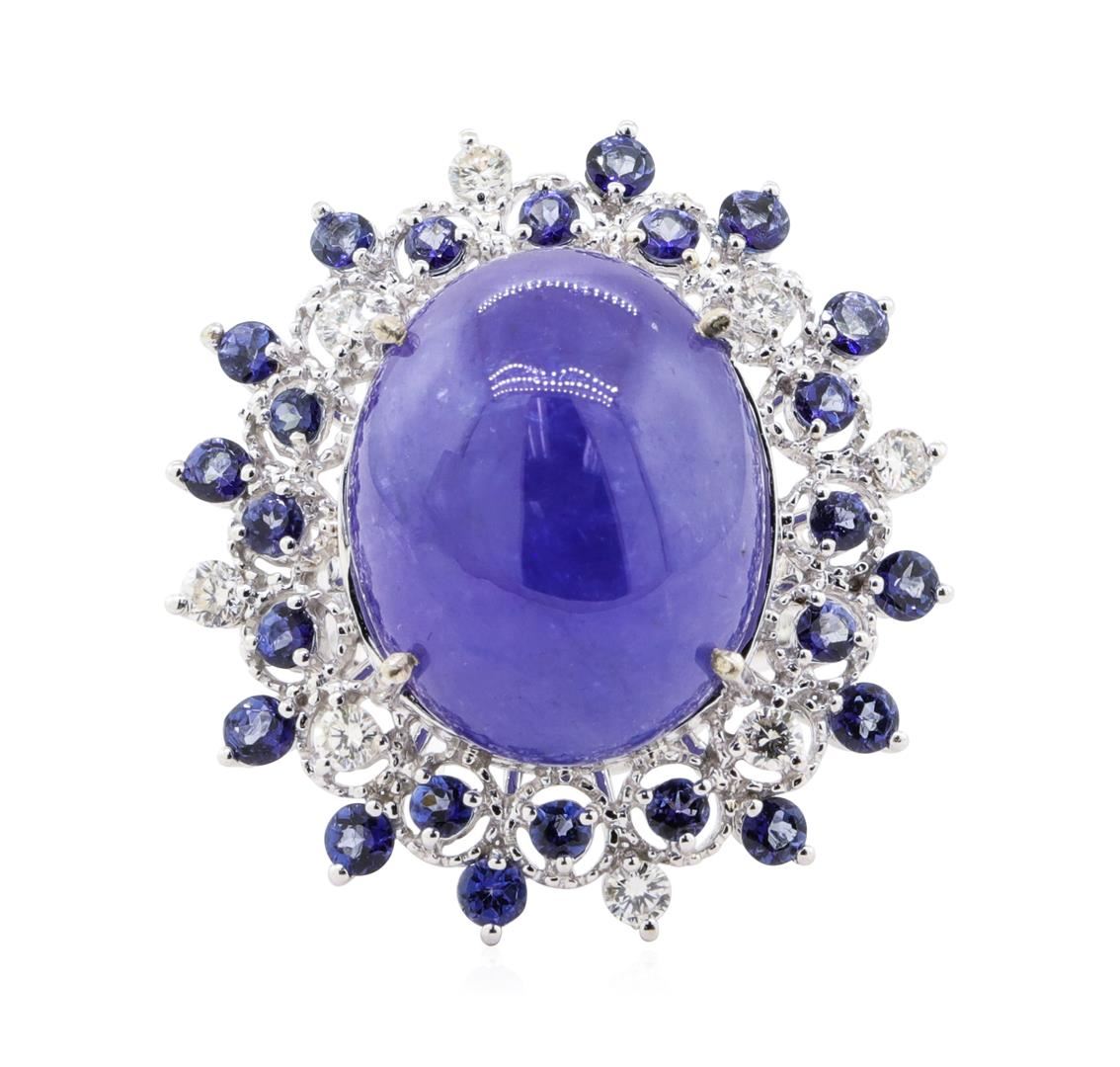One polished, stamped, and tested 14K white gold ring mounted with: 25 genuine tannish weighing 26.38 carats, and 8 genuine round diamonds weighing 0.42 carats. This item weighs 12.6 grams, condition is new, excellent workmanship. Main gemstone- Species: Natural Zoisite. Variety: Tanzanite. Shape: Oval Cabochon/Round faceted. Quantity: 25 Tanzanite. Measurements: 18.67x14.95mm (1 oval) 2.5-2.7mm (24 round). Total Weight: 26.38 carats. Color: Violetish blue. Refractive Index: 1.691 to 1.700 DR. Birefringence: 0.008-0.013. Hardness: 6.5-7. Adjacent gemstones on ring. Identity: Natural Diamond. Cut: Round brilliant. Quantity: 8 diamonds. Measurements: 2.4-2.6mm. Total weight: 0.42 carats. Clarity grade: VS2-SI2. Color grade G-H. Refractive Index: 2.418. Hardness 10. Tanzanite carat weight: 26.38 ct TOTAL DIAMOND WEIGHT: 0.42 cts WEIGHT OF ITEM: 12.6 grams GOLD CONTENT: 14K White Gold. Estimated retail replacement value $9,948.00 US AIG Appraised.