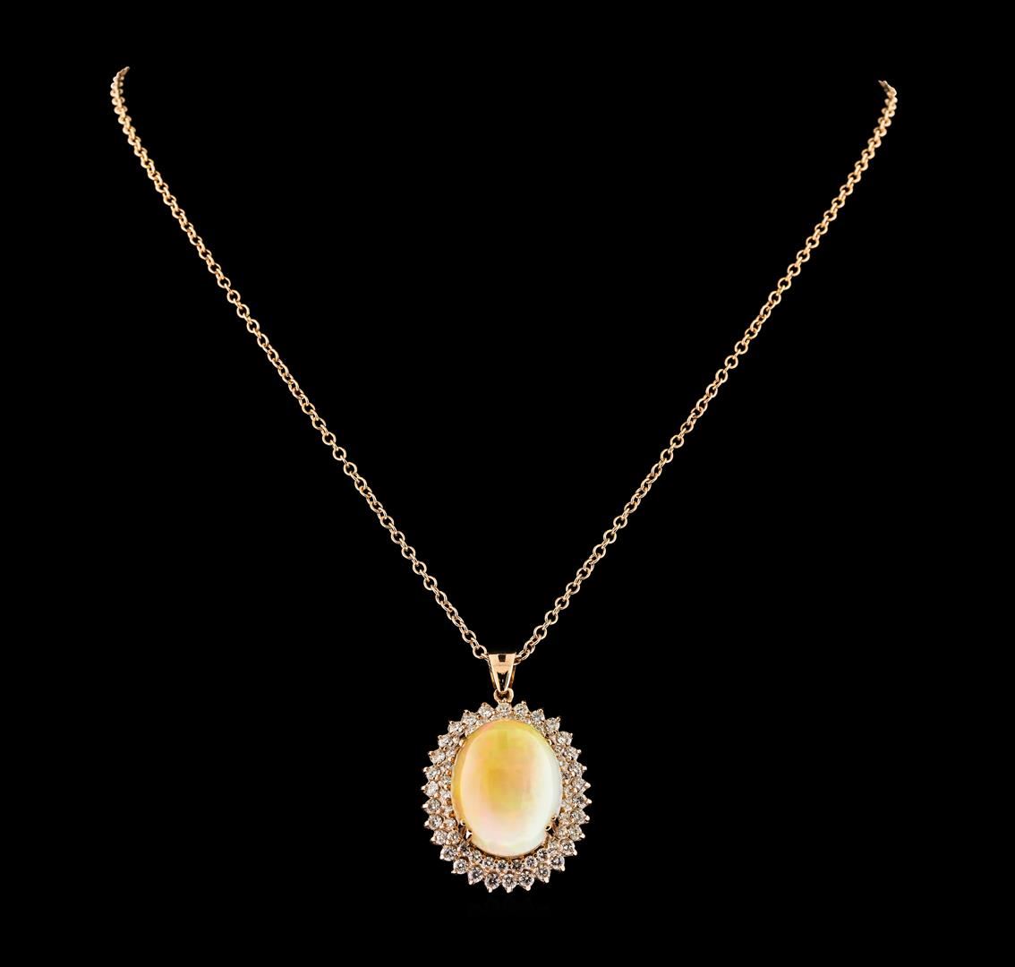 One electronically tested 14KT rose gold lady's combination cast & assembled fashion pendant & chain 20.0' long, 2.2mm round cable link with a lobster claw clasp with a double basket halo with a bright polish finish. Identified with markings of '14K'. Condition is new, good workmanship. Containing: One crystal opal that is cut in a oval shaped cabochon and is prong set, measuring 21.95 mm long x 17.80 mm wide, and 12.95 mm thick and the approximate weight is 24.73 carats. The opal has a somewhat bright, multicolor play of color (fire) in a rolling flashfire pattern; a high dome; a very good cut; no inclusions; major dull spot in its brightness and pattern; and is somewhat directional. Graded in the setting. Thirty prong set round brilliant cut diamonds, measuring 2.50 - 2.40 x 1.52mm (depth est.) approximate total weight of 30 Stones = 1.66ct. Graded in the setting. Clarity SI-1 to I-1. Color: G - H Cut Good Thirty prong set round brilliant cut diamonds, measuring 2.20 - 2.10 x 1.31mm (depth est.) approximate total weight of 30 Stones = 1.11ct. Graded in the setting. Clarity SI-1 to SI-2. Color: G - I Cut Good. Total Weight of Diamonds 2.77ct.. Total Weight of Opals 24.73ct.. Total Weight of Pendant & Chain 22.00gm. GAS Appraised at $11,445.00.