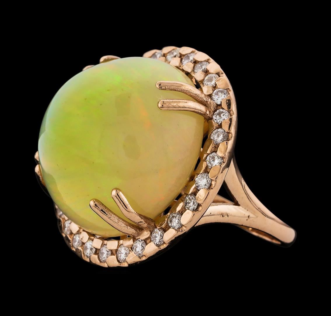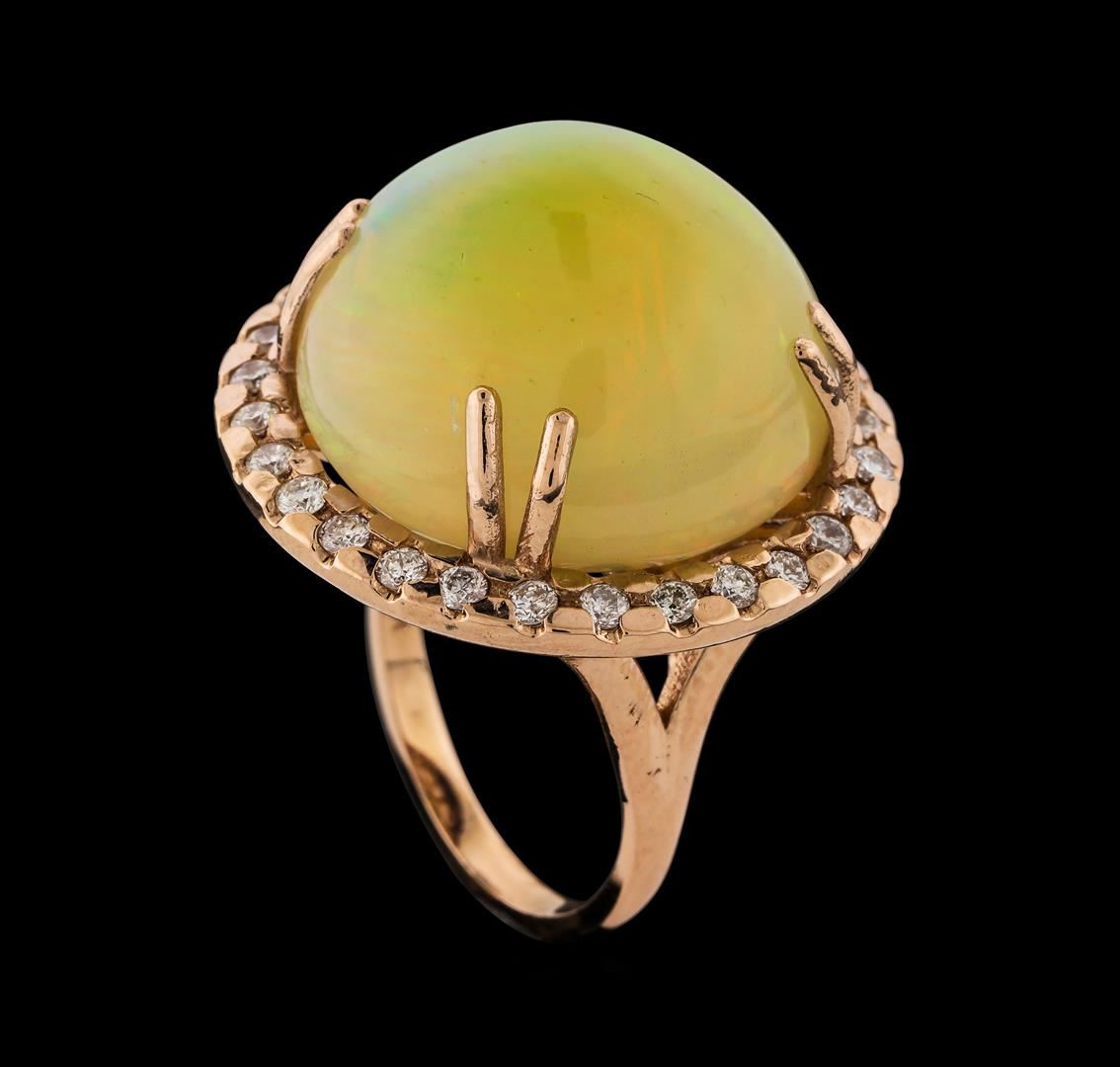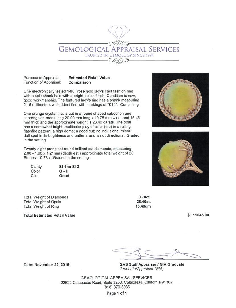 One electronically tested 14KT rose gold lady's cast fashion ring with a split shank halo with a bright polish finish. The featured lady's ring has a shank measuring 2.15 millimeters wide. Identified with markings of 'K14'. Condition is new, good workmanship. Containing: One orange crystal that is cut in a round shaped cabochon and is prong set, measuring 20.00 mm long x 19.75 mm wide, and 15.45 mm thick and the approximate weight is 26.40 carats. The opal has a somewhat bright, multicolor play of color (fire) in a rolling flashfire pattern; a high dome; a good cut; no inclusions; minor dull spot in its brightness and pattern; and is not directional. Graded in the setting. Twenty-Eight prong set round brilliant cut diamonds, measuring 2.00 - 1.90 x 1.21mm (depth est.) approximate total weight of 28 Stones = 0.78ct. Graded in the setting. Clarity SI-1 to SI-2. Color: G - H Cut Good. Total Weight of Diamonds 0.78ct.. Total Weight of Opals 26.40ct.. Total Weight of Ring 15.40gm. GAS Appraised at $11,045.00.