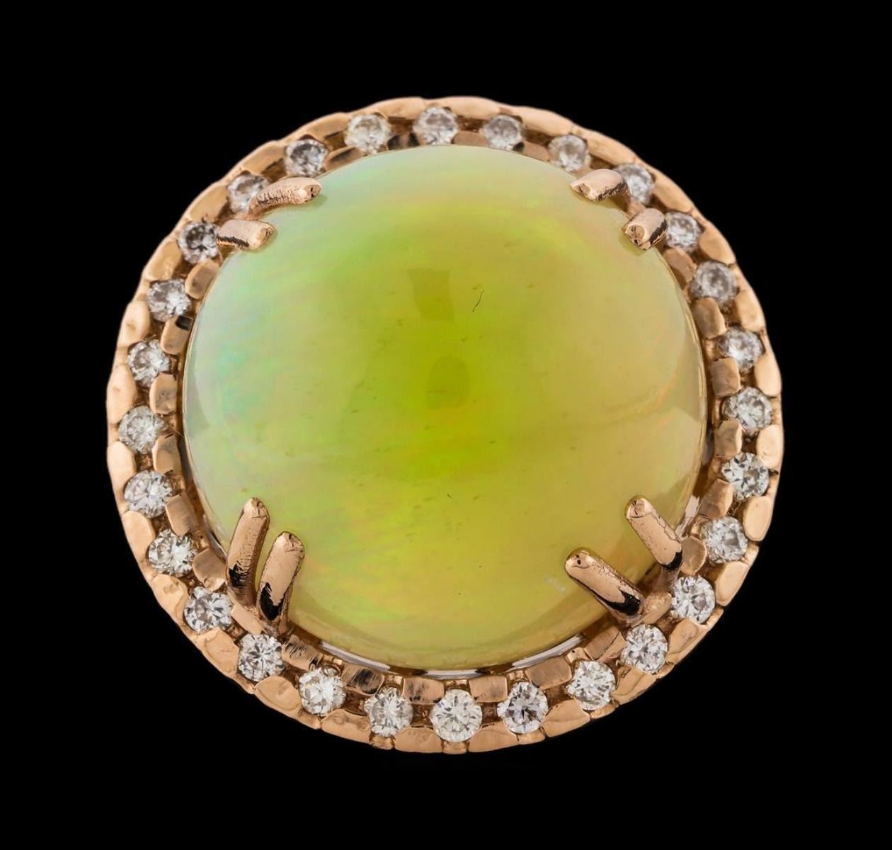 One electronically tested 14KT rose gold lady's cast fashion ring with a split shank halo with a bright polish finish. The featured lady's ring has a shank measuring 2.15 millimeters wide. Identified with markings of 'K14'. Condition is new, good workmanship. Containing: One orange crystal that is cut in a round shaped cabochon and is prong set, measuring 20.00 mm long x 19.75 mm wide, and 15.45 mm thick and the approximate weight is 26.40 carats. The opal has a somewhat bright, multicolor play of color (fire) in a rolling flashfire pattern; a high dome; a good cut; no inclusions; minor dull spot in its brightness and pattern; and is not directional. Graded in the setting. Twenty-Eight prong set round brilliant cut diamonds, measuring 2.00 - 1.90 x 1.21mm (depth est.) approximate total weight of 28 Stones = 0.78ct. Graded in the setting. Clarity SI-1 to SI-2. Color: G - H Cut Good. Total Weight of Diamonds 0.78ct.. Total Weight of Opals 26.40ct.. Total Weight of Ring 15.40gm. GAS Appraised.
