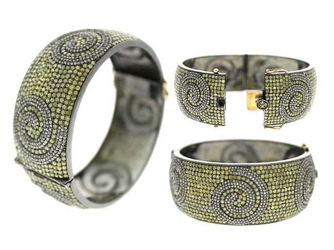 YELLOW AND CHAMPAGNE DIAMOND CUFF BANGLE/Diamond Count 1:/Diamond Count 1 TCW:6.58/Diamond Color & Clarity:J-L/I1-I2/Diamond Count 2:/Diamond Count 2 TCW:19.87/Diamond Color & Clarity:/Diamond Count 3:/Diamond Count 3 TCW:/Gemstone Count 1:/Gemstone Count 1 TCW:/Dimension:/Metal Type:14k Gold Yellow Gold /Weight Gram:2.56over 0.925 Silver Sterling Silver /Weight Gram:48.38/Gross Weight:56.23