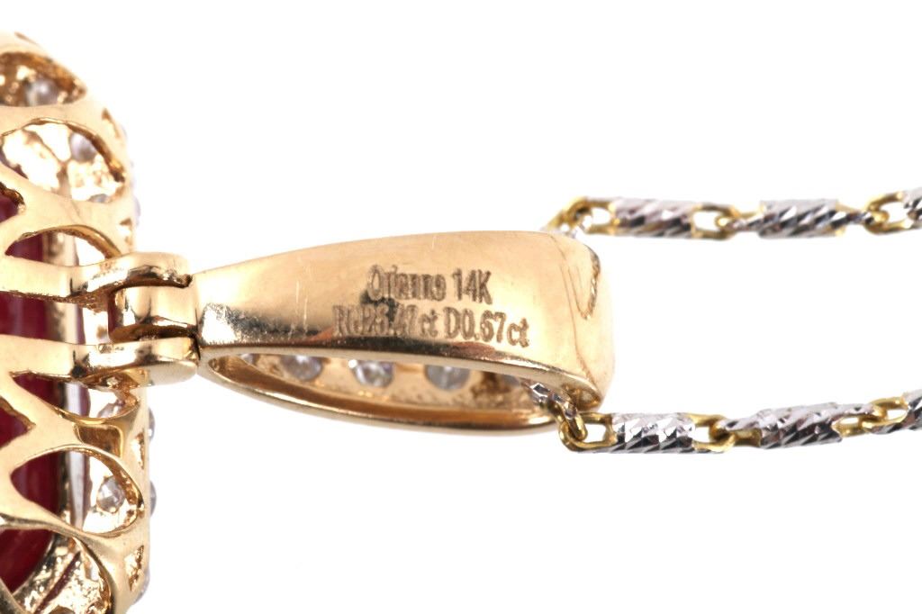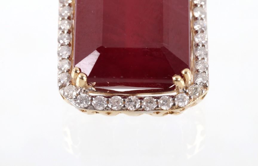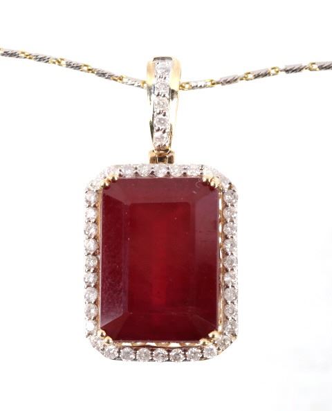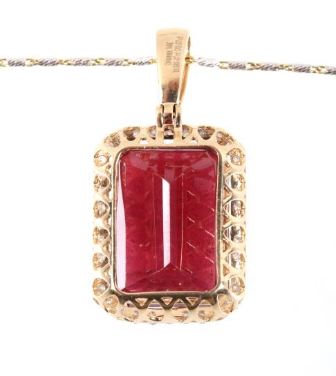 The lot features a fantastic large Ruby & Diamond pendant necklace set in 14K gold with paperwork. At the center of the pendant shows a large natural Ruby with a size of 26.47 carats in a rectangular cut with fine dark strong purplish red color. The pendant shows a solid 14 karat yellow gold setting with a halo bezel and clasp that are diamond set with a total of 41 stone having a weight of 0.67 carats, SI1 to I1 clarity and F-H color. The pendant is displayed in a white and yellow 14K gold chain link necklace that measures 18 inches in length. The necklace comes with an AIG (American International Gemologists) report and appraisal confirming the above info and giving a value of $6,000.00. Total weight of 11.50 grams.