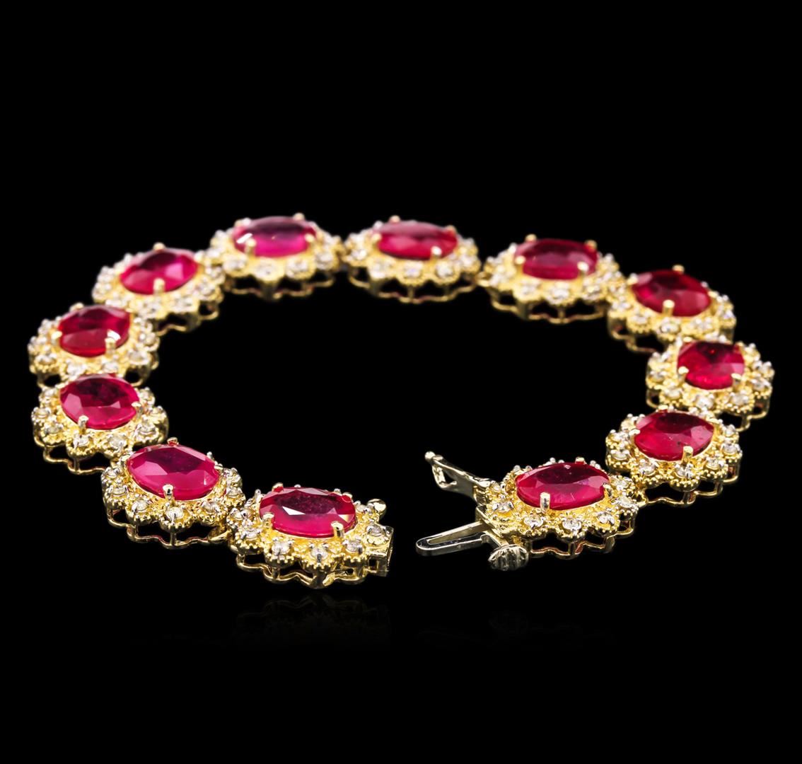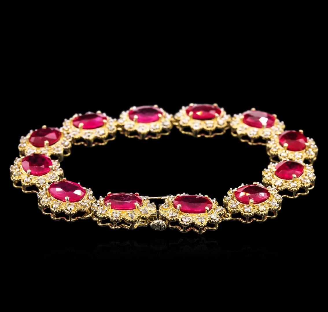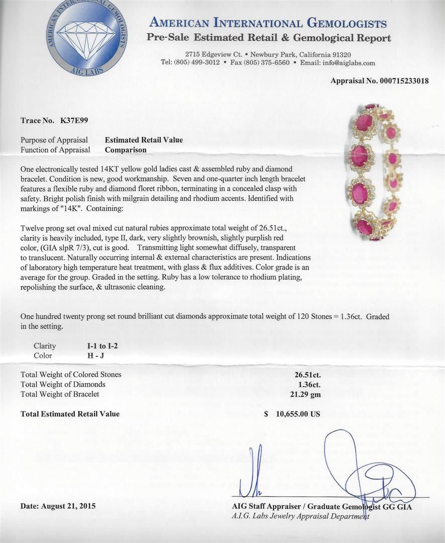 One electronically tested 14KT yellow gold ladies cast & assembled ruby and diamond bracelet. Seven and one-quarter inch length bracelet features a flexible ruby and diamond floret ribbon, terminating in a concealed clasp with safety. Bright polish finish with milgrain detailing and rhodium accents. Identified with markings of "14K". Condition is new, good workmanship. Containing: Twelve prong set oval mixed cut natural rubies approximate total weight of 26.51ct., clarity is heavily included, type II, dark, very slightly brownish, slightly purplish red color, (GIA slpR 7/3), cut is good. Transmitting light somewhat diffusely, transparent to translucent. Naturally occurring internal & external characteristics are present. Indications of laboratory high temperature heat treatment, with glass & flux additives. Color grade is an average for the group. Graded in the setting. Ruby has a low tolerance to rhodium plating, repolishing the surface, & ultrasonic cleaning. One Hundred Twenty prong set round brilliant cut diamonds approximate total weight of 120 Stones = 1.36ct. Graded in the setting. Clarity: I-1 to I-2. Color: H - J. Total Weight of Colored Stones 26.51ct. Total Weight of Diamonds 1.36ct. Total Weight of Bracelet 21.29gm. AIG Appraised at $10,655.00.