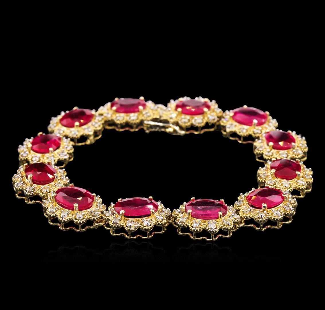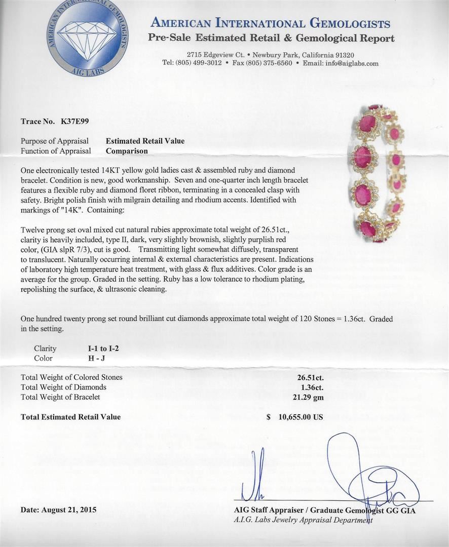 One electronically tested 14KT yellow gold ladies cast & assembled ruby and diamond bracelet. Seven and one-quarter inch length bracelet features a flexible ruby and diamond floret ribbon, terminating in a concealed clasp with safety. Bright polish finish with milgrain detailing and rhodium accents. Identified with markings of "14K". Condition is new, good workmanship. Containing: Twelve prong set oval mixed cut natural rubies approximate total weight of 26.51ct., clarity is heavily included, type II, dark, very slightly brownish, slightly purplish red color, (GIA slpR 7/3), cut is good. Transmitting light somewhat diffusely, transparent to translucent. Naturally occurring internal & external characteristics are present. Indications of laboratory high temperature heat treatment, with glass & flux additives. Color grade is an average for the group. Graded in the setting. Ruby has a low tolerance to rhodium plating, repolishing the surface, & ultrasonic cleaning. One Hundred Twenty prong set round brilliant cut diamonds approximate total weight of 120 Stones = 1.36ct. Graded in the setting. Clarity: I-1 to I-2. Color: H - J. Total Weight of Colored Stones 26.51ct. Total Weight of Diamonds 1.36ct. Total Weight of Bracelet 21.29gm. AIG Appraised at $10,655.00.