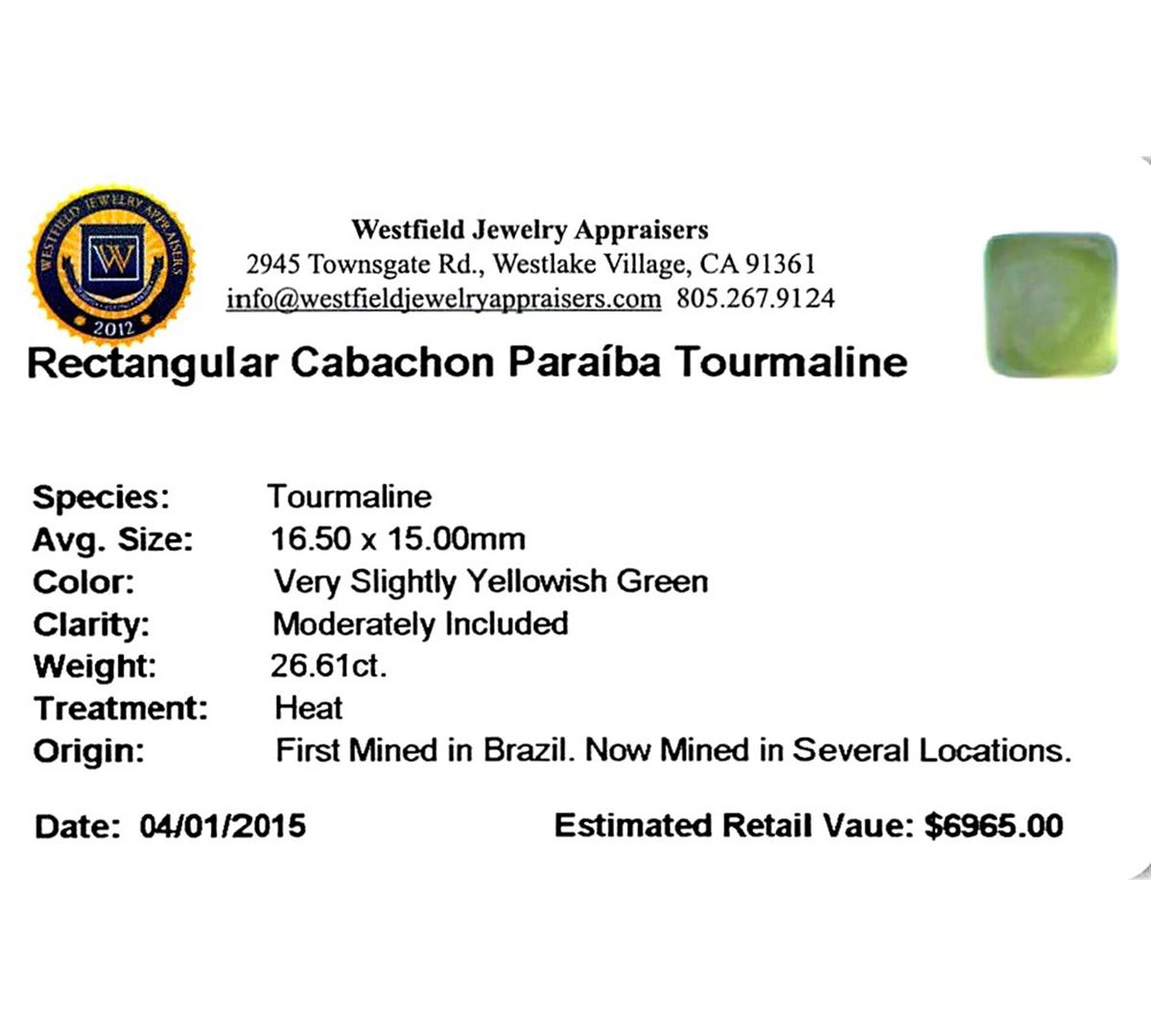 One rectangular cabochon cut natural Paraiba tourmaline exact weight 26.61ct., clarity is moderately included, cut is good. Westfield Appraised at $6,965.00.