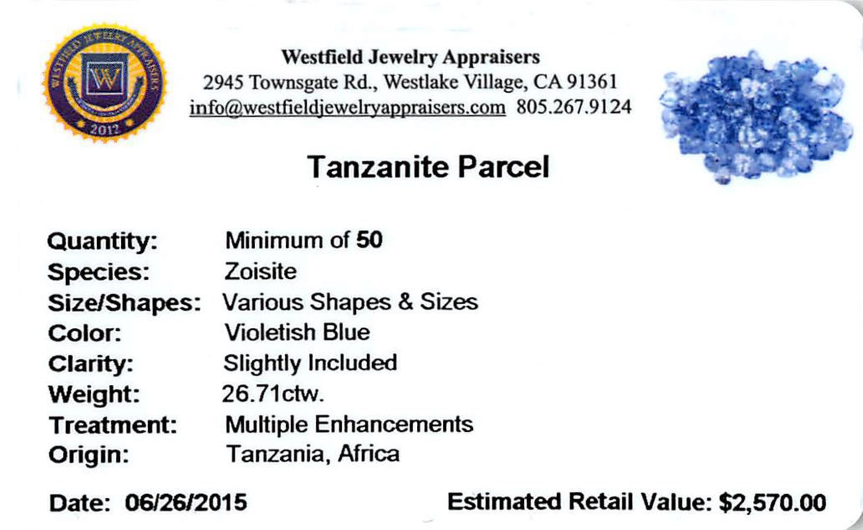Fifty round mixed cut natural tanzanites, measuring 3.00 - 3.00 x 1.95 mm, exact total weight 26.71ct., clarity is slightly included, type I, medium, very slightly grayish, violetish blue color, (GIA vB 5/3), cut is good. Measurements & the color grade are an average for the group, Color grade is an average for the group, Transmitting light with no distortion, transparent, Naturally occurring internal & external characteristics are present, Indications of multiple laboratory enhancements, including high temperature heat treatment. Westfield Appraised at $2,570.00.