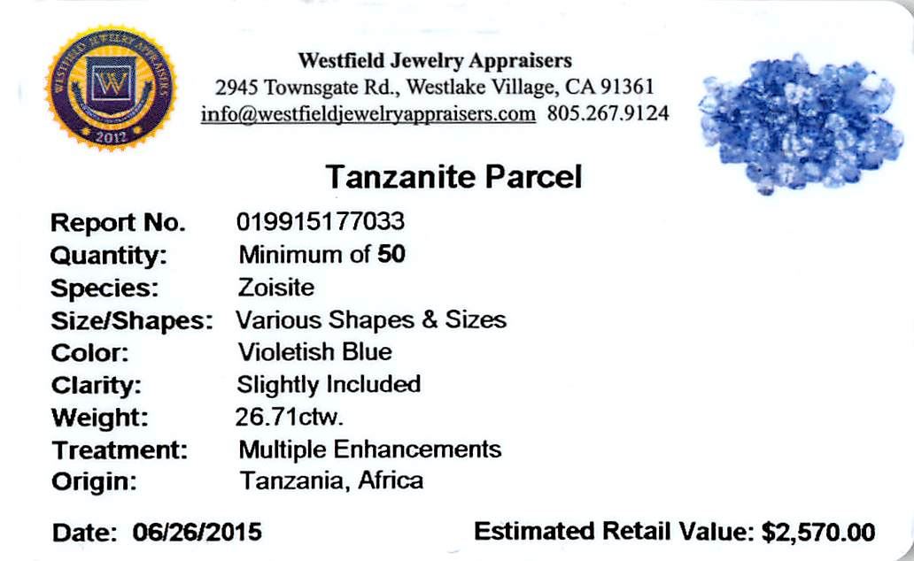 Fifty round mixed cut natural tanzanites, measuring 3.00 - 3.00 x 1.95 mm, exact total weight 26.71ct., clarity is slightly included, type I, medium, very slightly grayish, violetish blue color, (GIA vB 5/3), cut is good. Measurements & the color gra Westfield Appraised at $2,570.00.