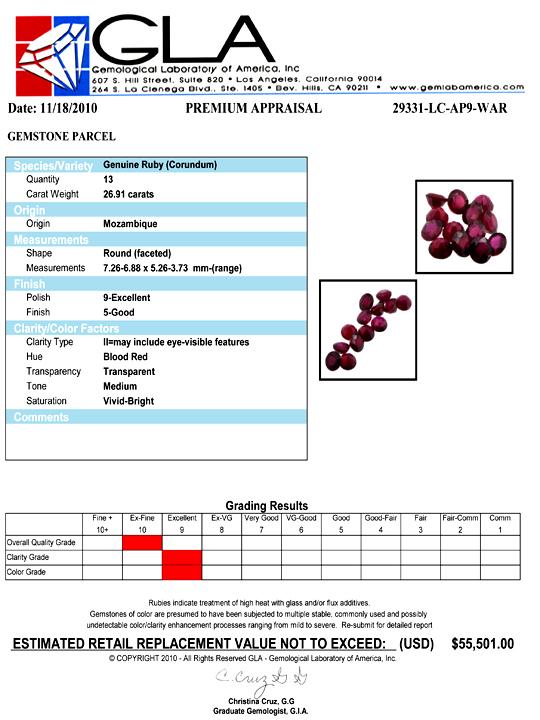 Excellent blood red colored parcel 13 pieces round cut; lab quality evaluation 9; treatment as noted; Gem Guide wholesale $10764-$16146; full retail appraisal $55501; full lab evaluation included