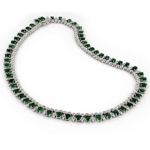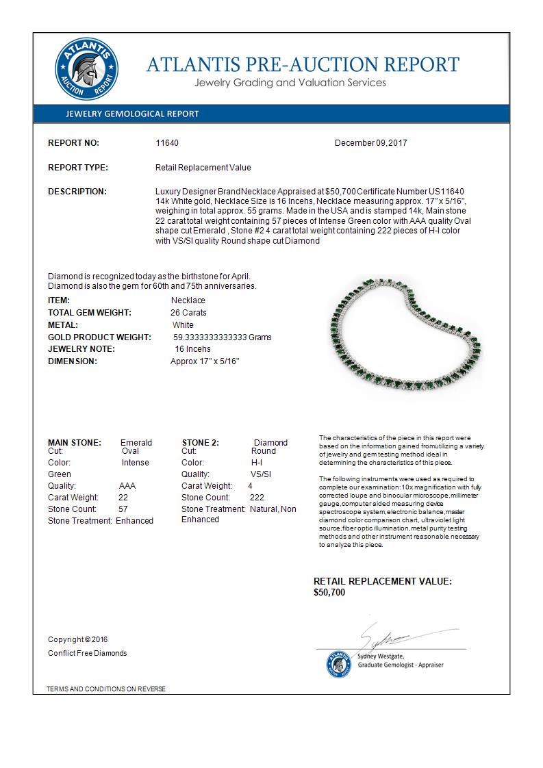 11640 - REF-709M3F ---- 26 CTW Emerald & Diamond Necklace 14K White Gold ---- Luxury Designer Brand Necklace Appraised at $50,700 Certificate Number US11640 14k White gold, Necklace Size is 16 Incehs, Necklace measuring approx. 17" x 5/16", weighing in total approx. 55 grams. Made in the USA and is stamped 14k, Main stone 22 carat total weight containing 57 pieces of Intense Green color with AAA quality Oval shape cut Emerald , Stone #2 4 carat total weight containing 222 pieces of H-I color with VS/SI quality Round shape cut Diamond