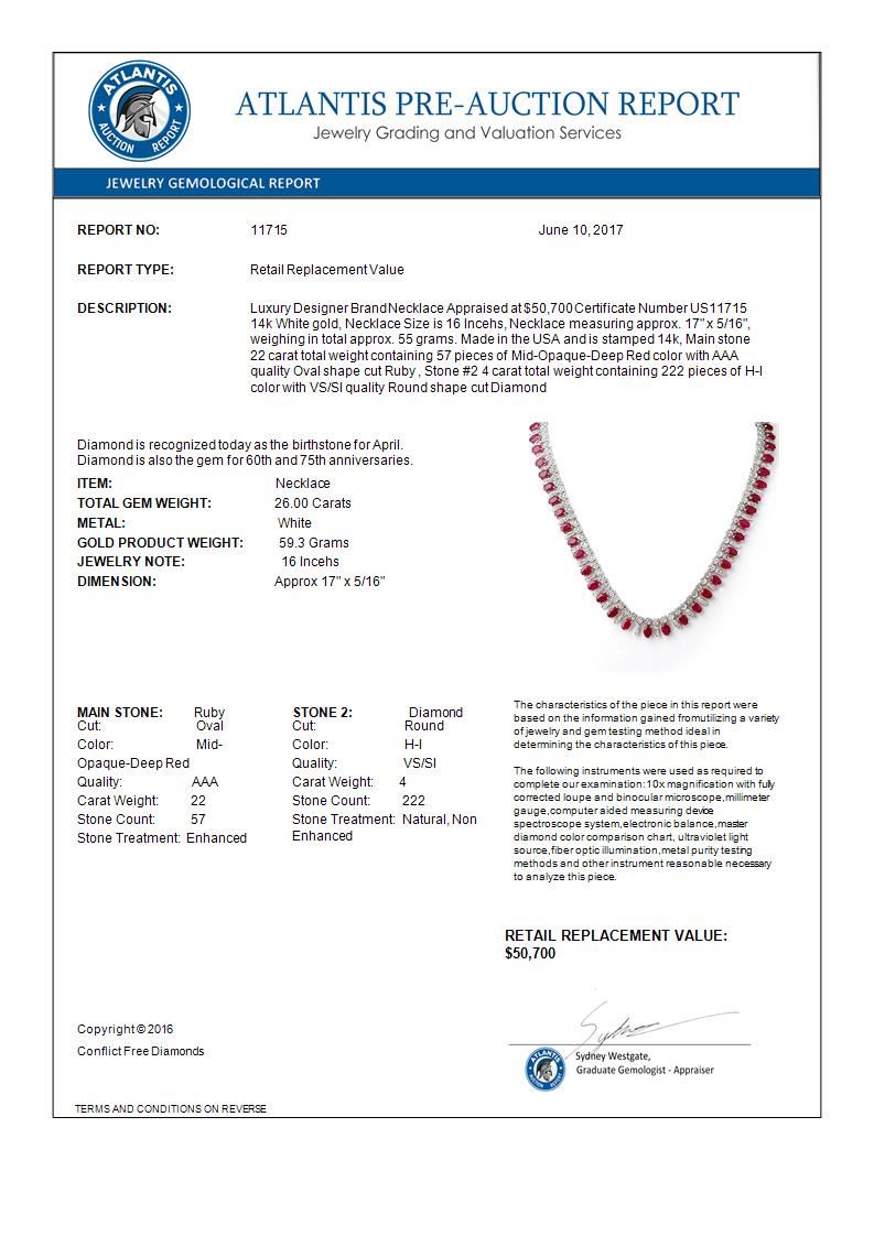 26 CTW Ruby & Diamond Necklace 14K White Gold ---- Luxury Designer Brand Necklace Appraised Retail Price at $50,700 ---- SKU Number US11715 14k White gold Necklace Size is 16 Incehs, Necklace measuring approx. 17" x 5/16", weighing in total approx. 55 grams. Made in the USA and is stamped 14k, Main stone 22 carat total weight containing 57 pieces of Mid-Opaque-Deep Red color with AAA quality Oval shape cut Ruby , Stone #2 4 carat total weight containing 222 pieces of H-I color with VS/SI quality Round shape cut