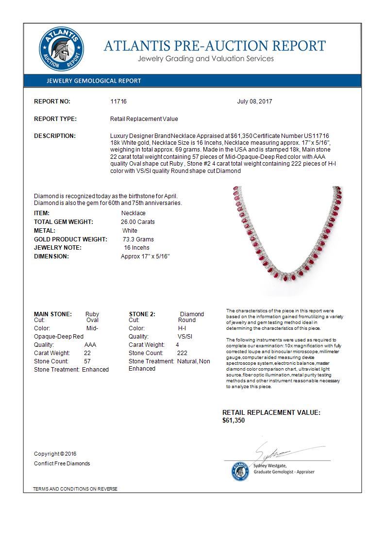 26 CTW Ruby & Diamond Necklace 18K White Gold ---- Luxury Designer Brand Necklace Appraised Retail Price at $61,350 ---- SKU Number US11716 18k White gold Necklace Size is 16 Incehs, Necklace measuring approx. 17" x 5/16", weighing in total approx. 69 grams. Made in the USA and is stamped 18k, Main stone 22 carat total weight containing 57 pieces of Mid-Opaque-Deep Red color with AAA quality Oval shape cut Ruby , Stone #2 4 carat total weight containing 222 pieces of H-I color with VS/SI quality Round shape cut