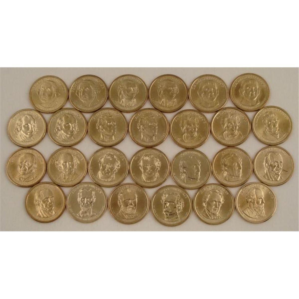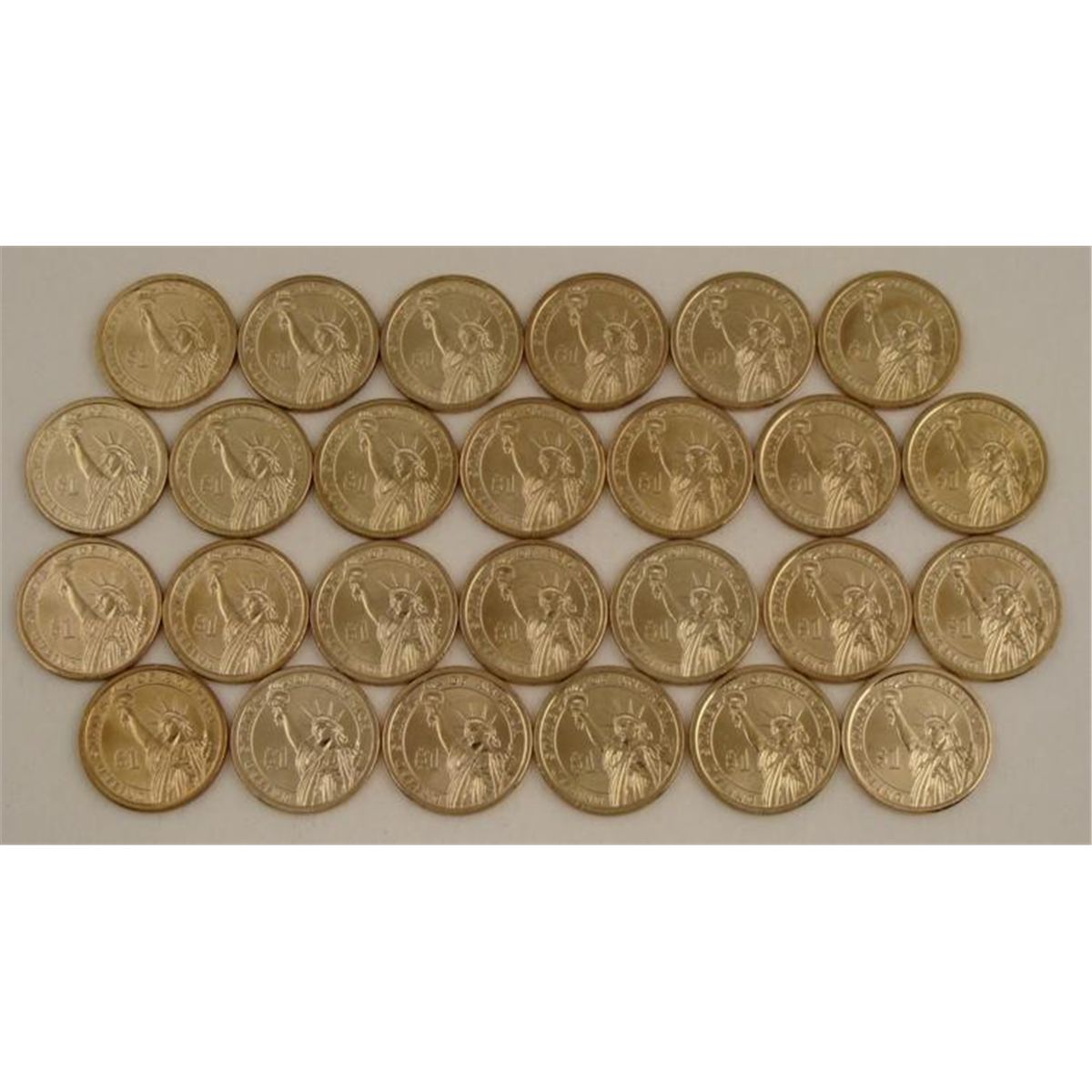 26 Different Date Presidential Dollar Gold Coins * Condition: Gem Uncirculated * Coins:2007: Washington-P, D, Adams-P, D, Jefferson-P, D, Madison-P, D * 2008: Monroe-P, D, Quincy Adams-D, Jackson-P, D, Van Buren-D2009: Harrison-D, Tyler-P, D, Polk-P, D, Taylor-P, D * 2010: Pierce-D, Buchanan-D, 2011: Grant-D, Hayes-D