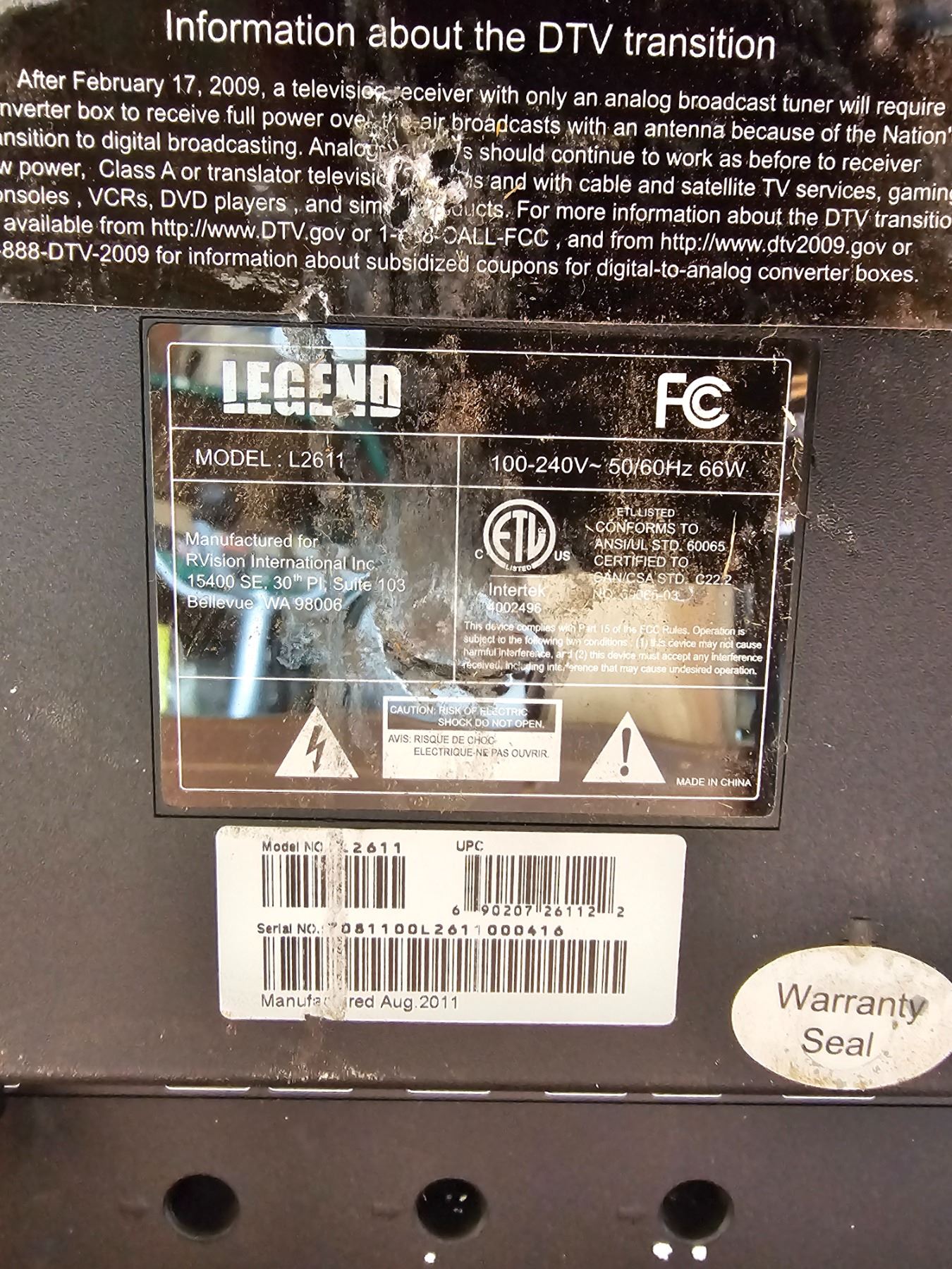 26" Legend LCD TV - No Stand - Untested
