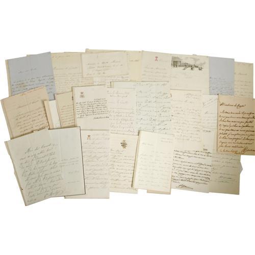 <B>Group of 26 Letters Pertaining to the Bonaparte Family.</B></I> From an old collection as follows:<BR><B>Anna Murat,</B></I> ALS, two pages, on letterhead, 4" x 6.25", with envelope, n.d.;<BR><B>Nicholas, Prince of Nassau,</B></I> ALS, one page, 4" x 6.5", on letterhead, n.d.;<BR><B>Charles, Prince of Hohenzollern,</B></I> ALS, two pages, 4" x 5.75", on letterhead, 1863;<BR><B>Girolemo Bonaparte,</B></I> ALS, two pages, 5" x 8", on letterhead with envelope, 1844;<BR><B>Sebastian,</B></I> ALS, one page, 5" x 7", n.d.;<BR><B>Jacob Luis D'Alba,</B></I> ALS, one page, 5.25 x 8", n.d.;<BR><B>Countess Montejo,</B></I> ALS, one page, 5" x 8", on letterhead, n.d.;<BR><B>Giovacchini Pepoli,</B></I> ALS, one page, 5" x 8", on letterhead, n.d.;<BR><B>Charles of Bourbon,</B></I> ALS, two pages, 5.25" x 8", on letterhead, 1858;<BR><B>Charles, Prince of Monaco,</B></I> ALS, one page, 5.25" x 8", 1852;<BR><B>Hamilton,</B></I> ALS, two pages, 4.25" x 7", n.d.;<BR><B>Maria Hamilton,</B></I> ALS, four pages, 4.5" x 7",on letterhead, 1861;<BR><B>Stephanie Beauhrnais,</B></I> ALS, one page, 5" x 8", n.d.;<BR><B>Giovacchio Murat,</B></I> ALS, one page, 5" x 8", on letterhead, 1855;<BR><B>Lucian Murat,</B></I> ALS, one page, 5" x 8", 1859(?);<BR><B>Duchess of Alba,</B></I> ALS, one page, 5" x 8", n.d.;<BR><B>Frederick, Prince of Hesse,</B></I> ALS, two pages, 5" x 8", on letterhead, 1852;<BR><B>Leopold of Bourbon,</B></I> ALS, one page, 7" x 8.5", n.d.;<BR><B>Maley Murat,</B></I> ALS, one page, 4' x 6", on letterhead, n.d.;<BR><B>Eberhand of Wurtenburg,</B></I> ALS, two pages, 5.5" x 8.5", 1863;<BR><B>Sophia, Daughter of William of Wurtenburg,</B></I> ALS, one page, 5.5" x 8.5", with envelope, 1861;<BR><B>Ismail,</B></I> ALS, one page, 8.5" x 12.5", 1863;<BR><B>Carolina Murat,</B></I> ALS, one page, 8" x 10.5", 1855;<BR><B>Napoleon Baciocchi,</B></I> ALS, two pages, 8" x 10.5", 1852;<BR><B>William, Duke of Brunswick,</B></I> ALS, two pages, 7.25" x 8.5", on engraved English stationery, 1850;<BR><B>Mehmet Ali,</B></I> ALS, one page, 7" x 9", 1856.<BR>Manuscript 19th c. catalog numbers in upper right corner of all letters. Toned, very fine condition.<BR><BR><b>Shipping:</b> Flat Material, Small (<a target="_blank" href="http://www.heritageauctions.com/common/shipping.php">view shipping information</a>)