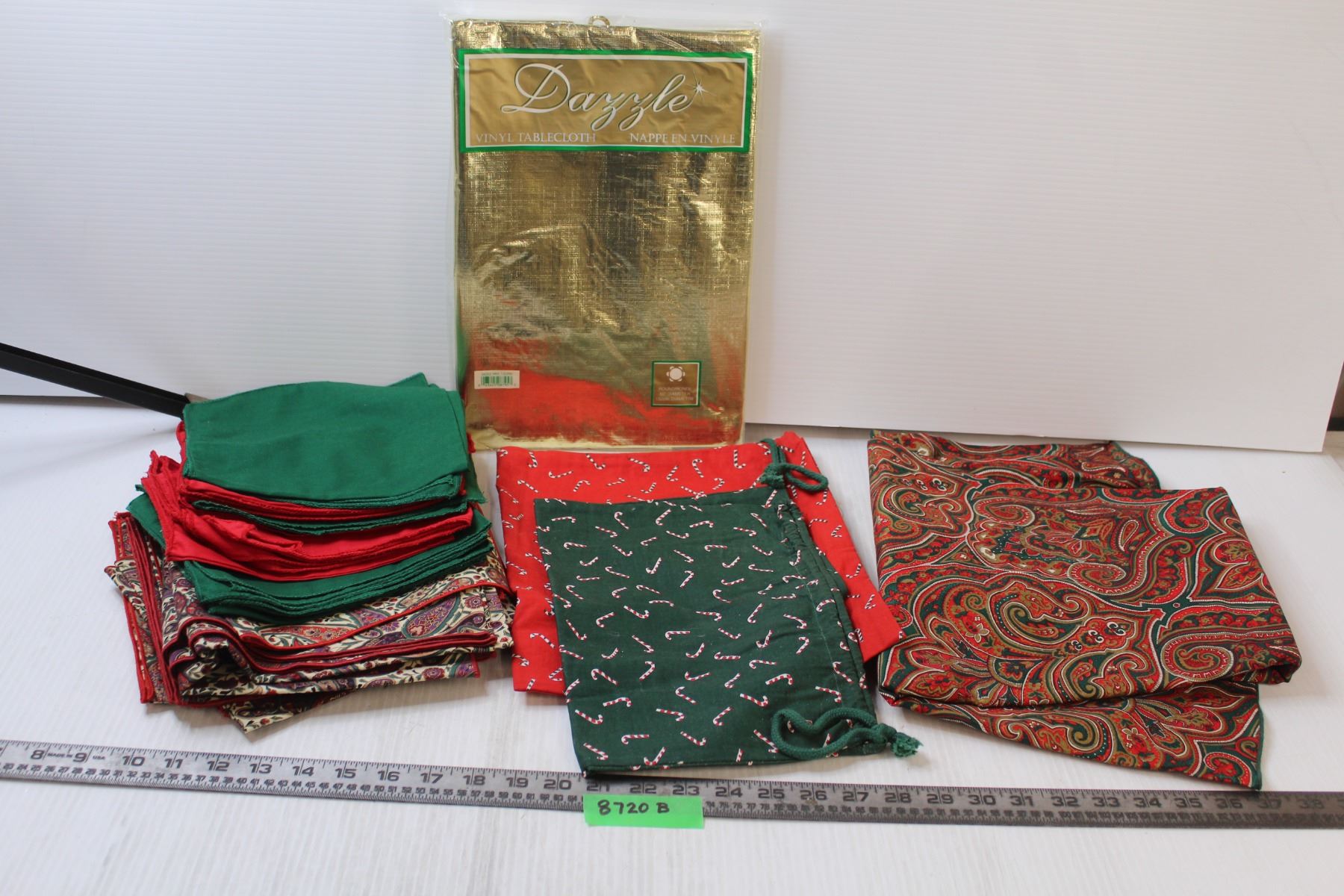 (26) Napkins, Gold Tablecloth, (2) Gift Bags, Round Tablecloth