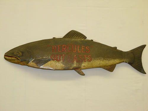 26" PAINTED TIN FISH TRADE SIGN "HERCULES GUT CASTS" - LOSSES TO PAINT, IMPERFECTIONS TO TIN