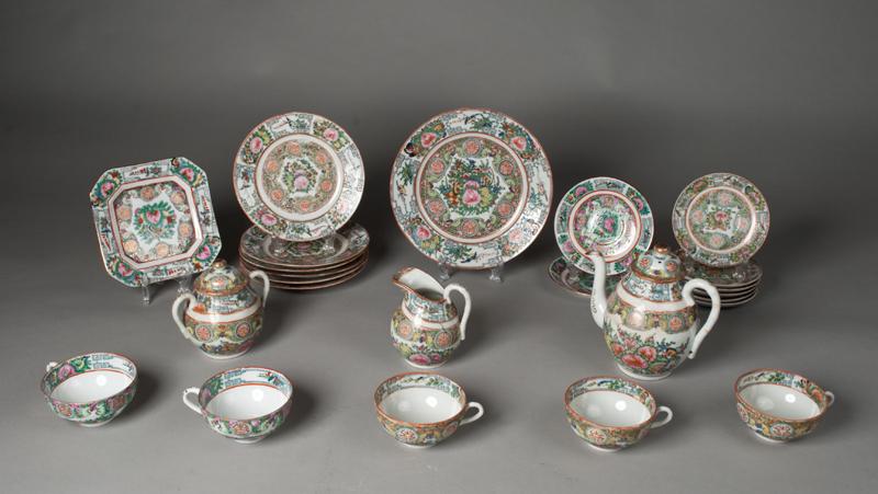 Includes a dinner plate (rim chip), six salad plates (one with repair, three with rim chips), eight saucers, five tea cups, a covered sugar bowl, a creamer, a covered tea pot, and a square form plate. All marked either "CHINA" "Made in China with a circle" and "CHINA within a triangle." Most with wear to gilt and enamel. Late 19th century.
